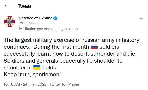 Publicerat Mars 26, 20224 yr Detta är en populär post. Två äldre herrar sitter på en parkbänk i Moskva och pratar, plötsligt säger den ene: -Vet du, President Putin säger att den speciella militära operationen i Ukraina egentligen är ett krig mellan Ryssland och NATO. -Jasså, hur går det? -Hittills har vi förlorat 15 800 dödade soldater, 6 Generaler, 530 stridsvagnar, 1597 pansarfordon , 1033 mjuka fordon, 280 haubitsar, 82 salvpjäser, 47 luftvärnssystem, 108 flygplan, 124 helikoptrar och 50 drönare. -Wow! Och NATO då? -Nä, de har inte dykt upp än...