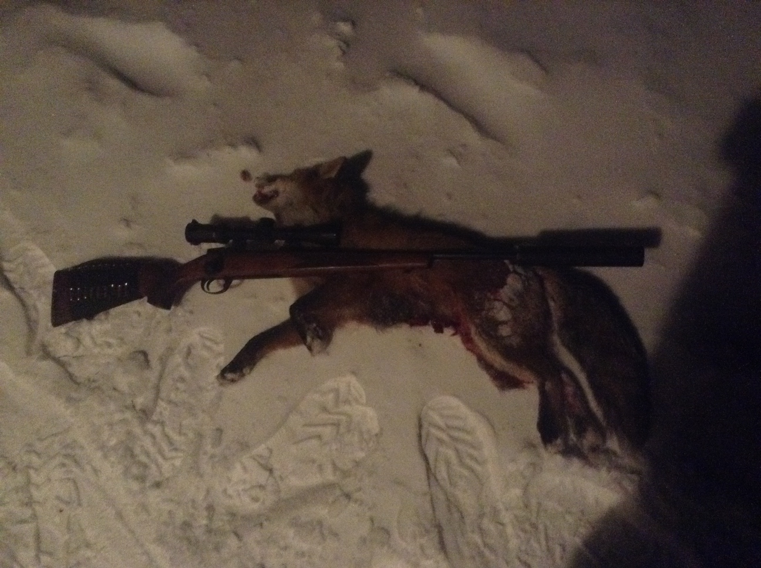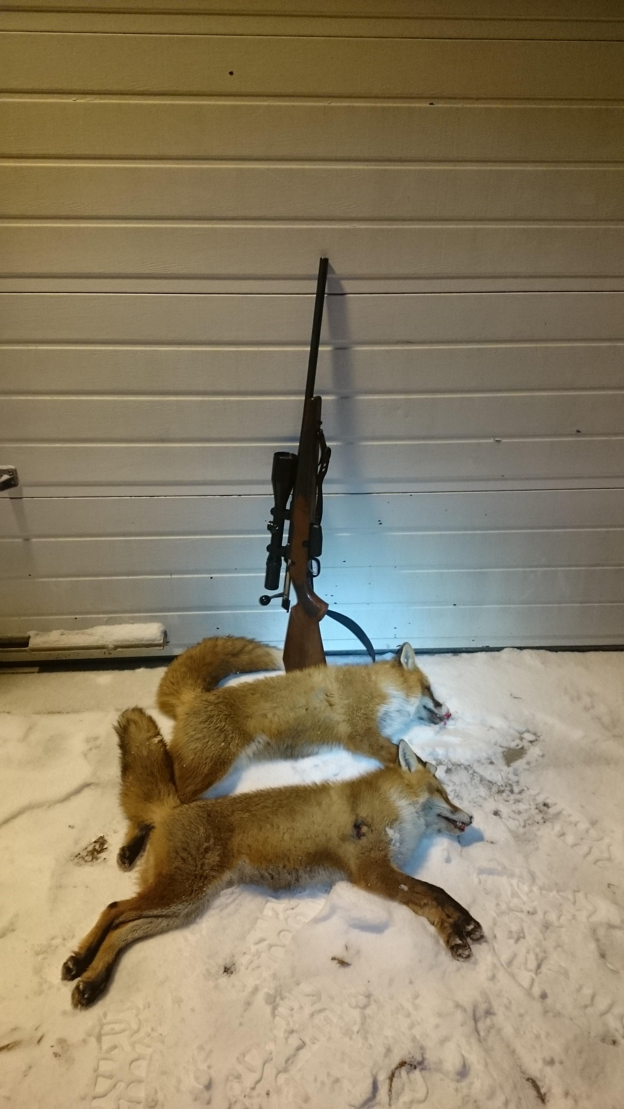 Publicerat Januari 6, 20179 yr Detta är en populär post. Sköt min första dubblé på åteln nu ikväll :-) Satte mig 19:00, halvtaskigt ljus pga moln och snöfall men det har varit mycket aktivitet så jag gav mig fan på att sitta tills det kommer någon räv. Kl 22:50 kommer det en som jag skjuter på ca 30m. Sitter kvar ett tag till och kl 23:40 kommer räv nr 2 fram och blir på ungefär samma ställe som den första. En tik och en hane, tiken kom först. Knallfall på båda, 222rem och 50gr v-max. Inte illa sönderskjutna heller, på bilden ligger de med utgångssidan uppåt.