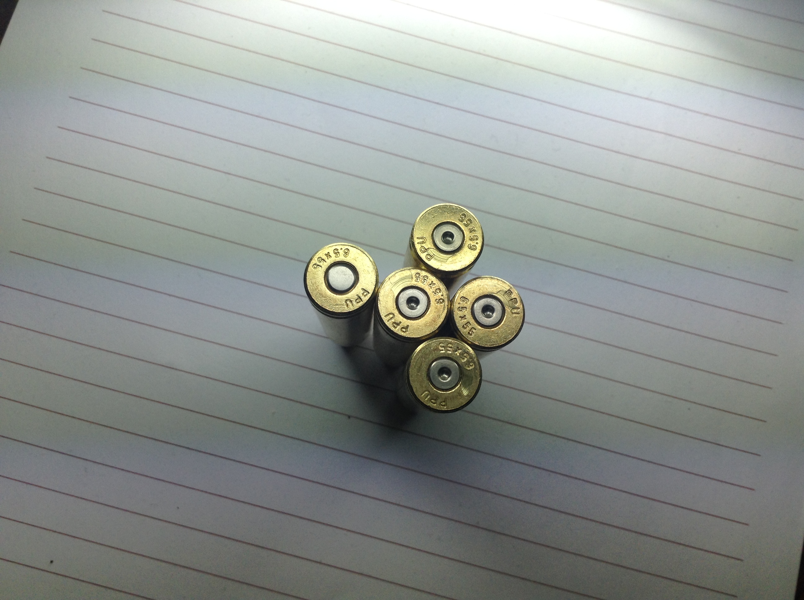 Publicerat Oktober 8, 20169 yr Jag följde erat råd och följde Ladeboken ist för granngubben. Laddade min 95 grain v-Max efter den här, det var det närmaste jag kunde komma v-maxen i deras tabeller för 6,5x55. Blev 4 skott på 41, 42 och 43 grains Vv N150. COL 70,5mm. CCI 250 tändhatt. Mitt verktyg fick den inte till 70 COL, det gick inge djupare. 41 grains fick gräslig träffbild, dubbelt så stor som 43 grains. 43 sköt tätast medan 42 var mittemellan i både grain och täthet, med det kanske var självklart, vad vet jag.. Jag ser inga tecken på högt tryck på tändhatten, ska jag prova att ladda ett grain till och se om jag får ihop gruppen lite till? Jag sköt ju en smäll med 44 grains laddning bara för att testa gubbens recept häromdagen och jag såg inget konstigt på tändhatten då heller. Alla tomhylsorna fick en 1,5mm bred svart sotkrans runt halsen, men det fick även norma vulkan som har längre COL, kanske brukar bli så? Jag har aldrig granskat hylsor efter smällen innan jag började ladda själv. Jag är inte nöjd med träffbilden som den är nu, jag har gjort en snuddande treklöver med norma vulkan för nån vecka sedan! Vad är en nödvändig och realistisk grupp på 100 meter med 6,5x55 med inte helt optimalt stöd? Nu svamlar jag fritt om saker jag bara hört lite om, men jag testade att trycka ner en kula med fingrarna i hylsan så den bara fastnade i kanten och sen sköt jag i patronen i patronläget och låste slutstycket, det var inte mkt kulan åkte ner i hylsan! Om den ens gjorde det! Jag måste ha en friflykt på 7mm eller nåt? 76,8mm är COL efter att ha kamrats. Har för mig att 2-5mm är vad som rekommenderas? Har ni nå tips? Skavmärket på hylsorna kommer utan att avfyras, det är slutstycket som skavt på nåt vänster.