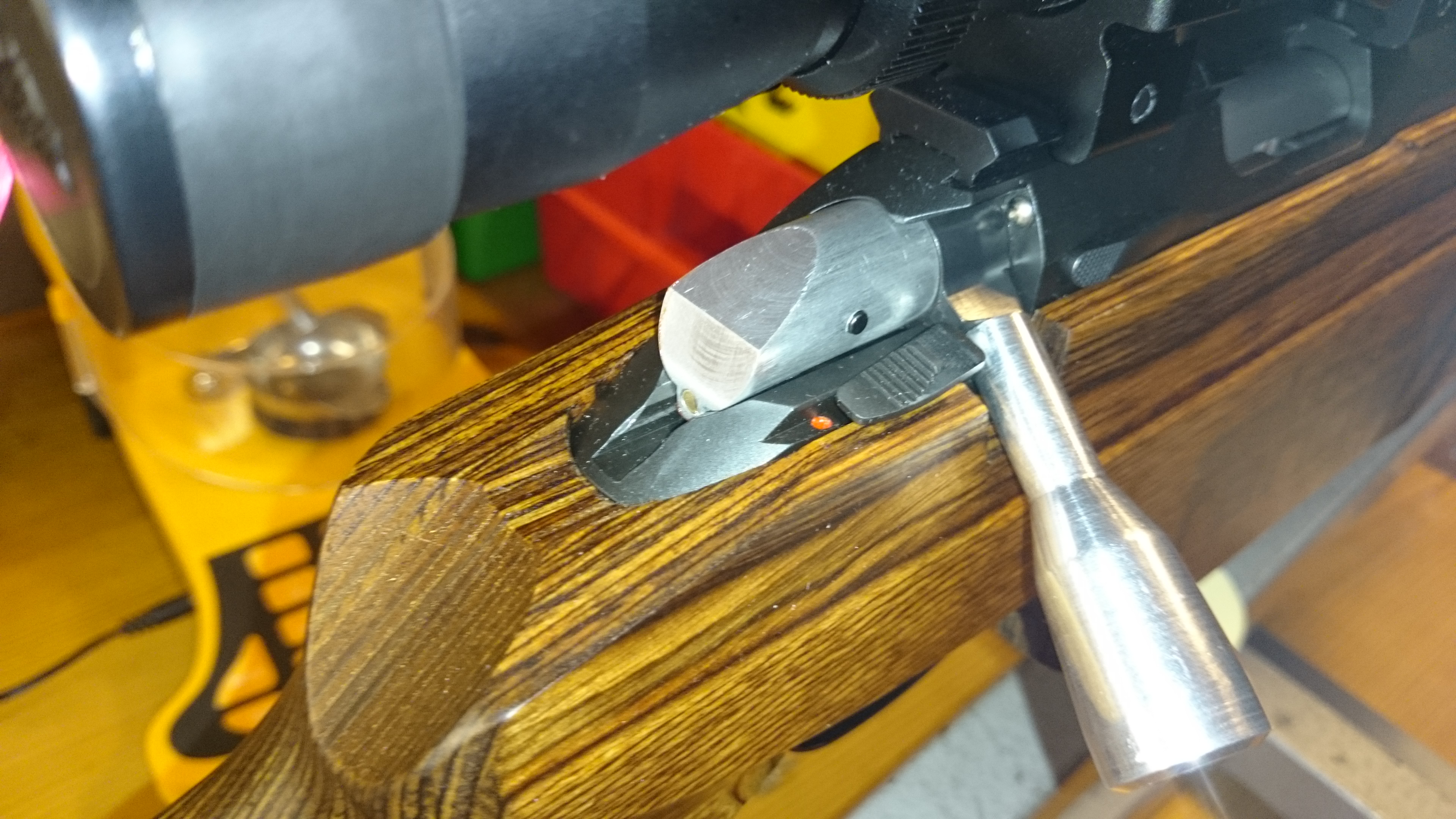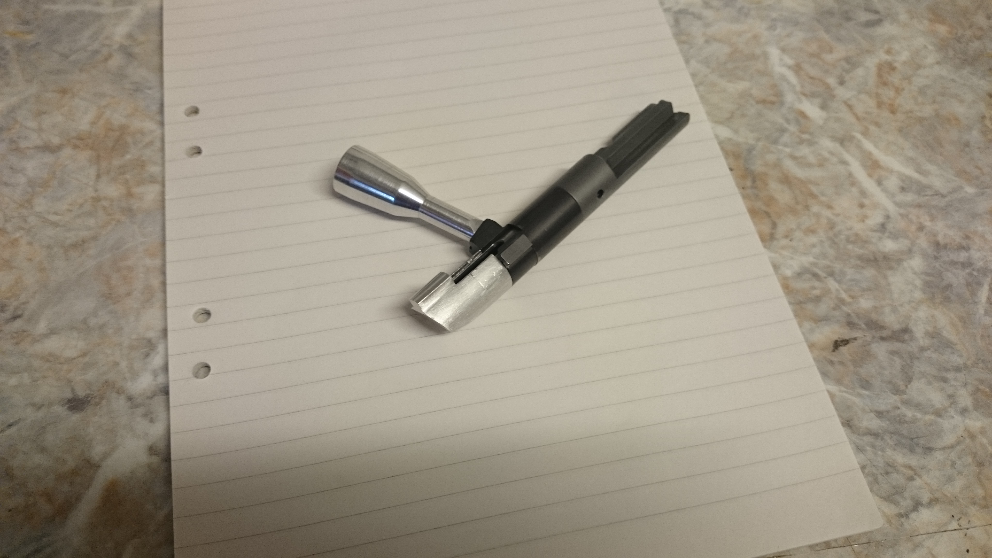 Publicerat December 28, 20169 yr Detta är en populär post. Ett projekt jag gjorde för 1 år sen eller så och presenterade på RS, men det är det hemmameckel jag känner mest stolthet i att ha gjort och kan lika gärna dela med mig här oxå i brist på annat att göra. Jänkarna brukar vara snabba ut med tillbehör men till quaden har det inte kommit ut någon styrhylsa i metall, så jag gjorde en egen. Bilderna är från start av projektet med den första testmonteringen till slutmontering av den färdiga ytbehandlade delen. Grovformad med svarv/fräs och filad någotsånär i form för hand. Första monteringen. Första testet i bössan. Här syns uppspänningsvisaren sticka ut, den är gjord mässing. Här är den i avfyrat läge. Så här blev det monterat och klart, här syns även det nyaste handtaget jag gjorde och lät anodisera. Både hylsa och handtag fick en hård glasblästring innan anodiseringen för att få en matt yta som matchade lådan bättre.