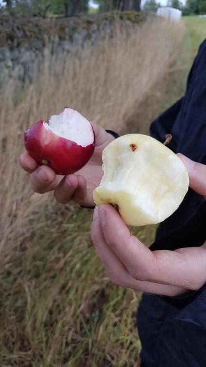 Publicerat Juli 5, 20196 yr Detta är en populär post. Provat: att ta en spade, tryckt ner den i jorden, pressat åt sidan och släppt ner ett äpple och dragit upp spaden att lägga äpplen i en spann ute, helt oskyddat, så de nu ruttnat. Sedan bara lagt ut dem ovanpå marken här och var att kasta fallfrukt i olika riktningar på och från tomten. Nu finns tre metoder att jämföra... Allt ovan gäller vildapel. Har fått berättat för mig, och det från flera håll, att om man tar kärnor från odlade ätäpplen, så är förhållandet ungefär att ett av 10.000 blir ett nytt ätbart, alltså för mänska välsmakande, äpple. Så allt ovan gäller för att få nya vildaplar att ympa in goäpplen på. Har förresten även grävt upp några späda vildaplar och planterat dem där jag senare vill ha ätäpplen. Ifall fe rotar sig och växer, så ympar jag in de sorter vi vill ha på träden. Fått några biodlare att ställa kupor i vår närhet för bättre produktion av äpplen, såväl vilda som tama, för vårt och viltets fromma. Bröderna som satte ut dem är mycket nöjda! Tydligen är den ena, av två, den bäst producerande kupan de har! Det bådar ju gott! Både för växtlighet och för chanserna att kupornas närvaro blir återkommande! p.