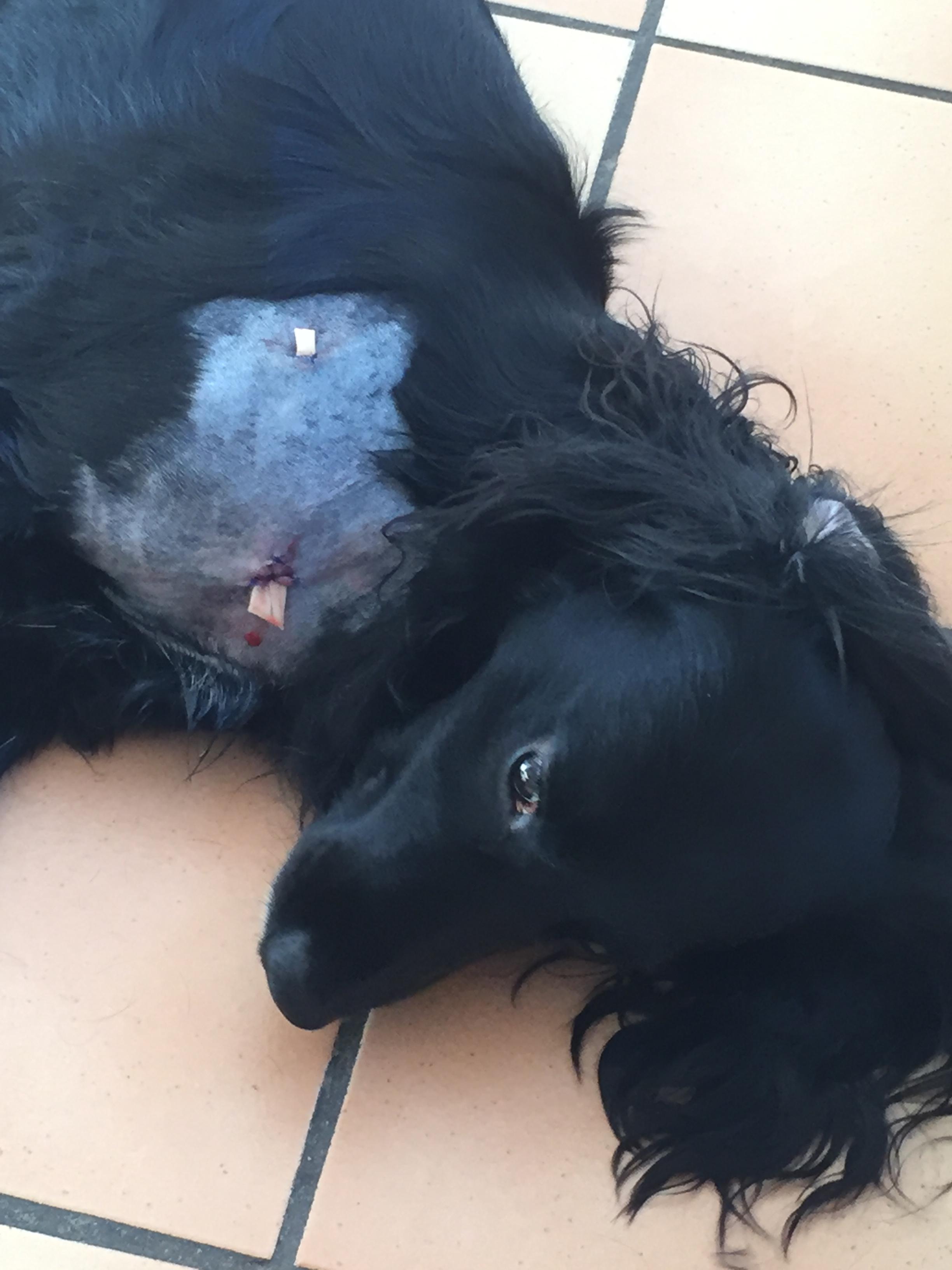 Jodå, han är pigg och glad som vanligt och har så varit sedan skadan. Han gillar dock inte sin lite udda frisyr?. Jakt igen när stygnen tas om några dagar. Hade änglavakt. Beten har följt insidan på skinnet, inga muskel- eller ledskador har upptäckts. Verkar mentalt helt opåverkad, ville på grisen igen. Det var en oskadad "mördargalt" och vad jag vet lever han än. Bra förståndigt arbete, men grisen gick in i det tätaste täta, fick försprång och lade sig i förhåll. Han räds inte stora galtar, tyvärr kan jag tycka.