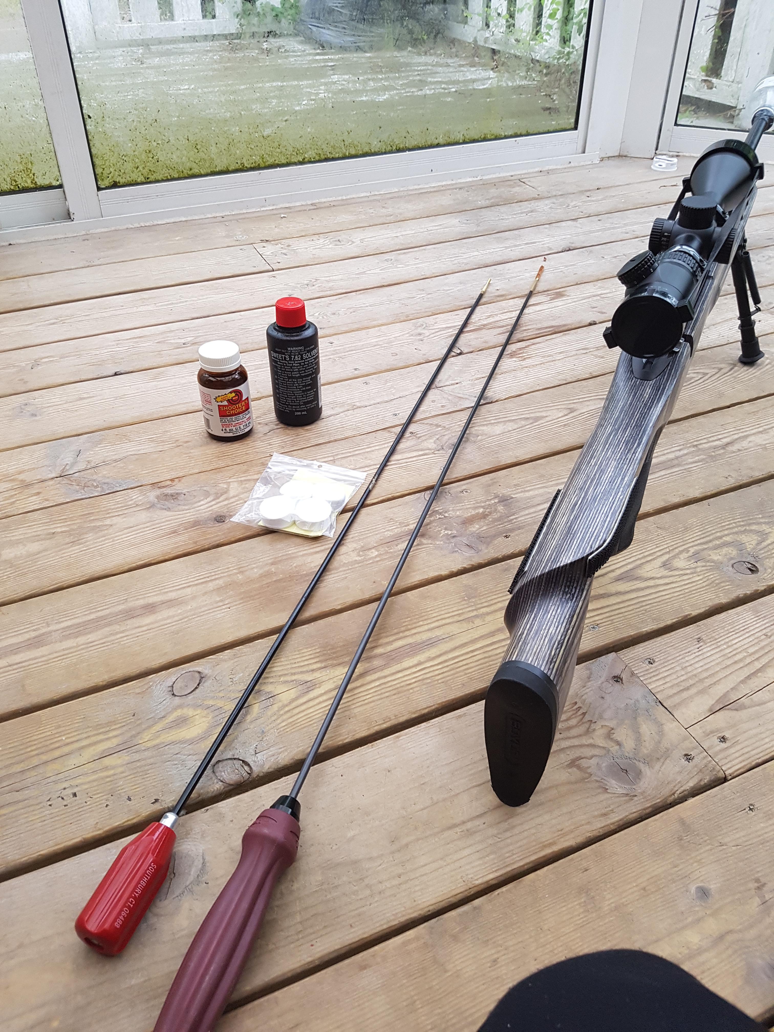 Publicerat Juli 28, 20178 yr Författare Detta är en populär post. Jaha igår körde jag en "prepair for the range day" ihop med dottern Först började vi med att försöka städa ur bössan grundligt - det gick väll sisådär. Efter en timme med kolsvarta/blå lappar så tröttnade jag. Lite JB pasta eller forest skum i några timmar hade nog inte skadat. Får se om jag orkar skura mer på banan innan skjutning. Den bör ju iallafall vara 10x bättre nu än innan. Här nedan har vi samlat alla prylarna inför städningen. Såhär såg första lappen ut. Körde följande preparat - rätt eller fel, det var det som stod i skåpet så. Körde från vänster till höger med undantag att efter kopparlösaren (sweets) så körde jag bronsborste doppad i shooters choise igen 5-10x. Avslutade med en lapp dränkt i ballistol som drog gebom pipan och sedan drog jag ett par varv med bomullsmopp/"borste" för att ta bort det överblivna. Sen åkte vi igår kväll hem till far och laddade upp 25st 75grs V-max med 48grs MRP bakom Min erfarenhet är att V-max brukar skjuta väl i 6mm:arna. Så idag blir det skjutbanan Mvh Joacim