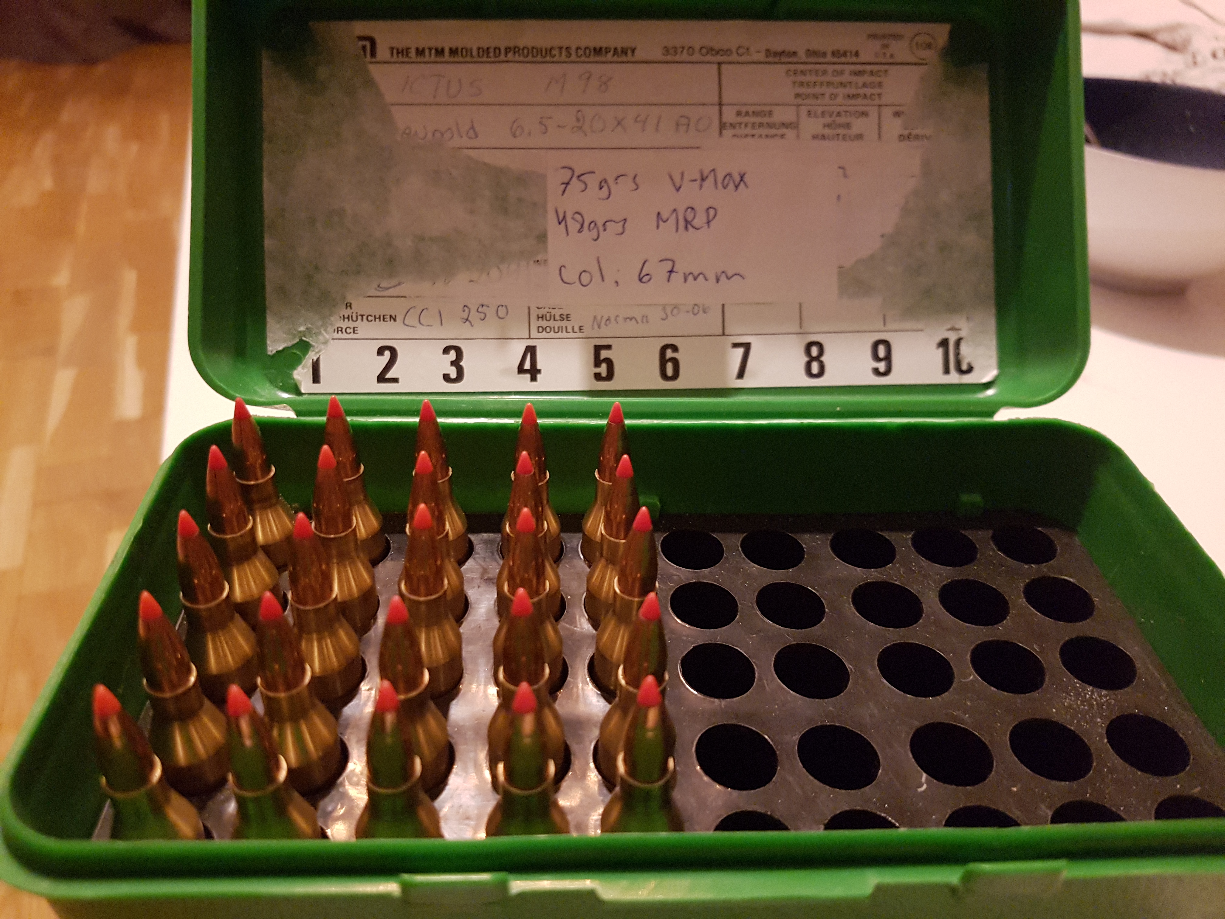 Publicerat Juli 27, 20178 yr Författare Detta är en populär post. Idag anlände ett vadderat kuvert med prylar från vapenvårdsbutiken. Imorgon har jag "preliminärbokat" en dag på skjutbanan - dottern får hänga med så avlastar det frun lite. Dessutom kom det ett paket i måndags med kulor från Chris (tack grabben ) - om jag minns rätt fritt ur minnet nu när jag sitter på stadsparken i Laholm så var det 58grs V-max, 65grs V-max, 70grs Sierra HP, 90grs Scenar, 90grs Berger Target (?) samt 105grs Scenar. Dessutom fick jag ett paket med 10st 75grs V-max från en signatur på grannkanalen. Så nu ska här testas lite olika meduciner Fortsättning följer Mvh Joacim