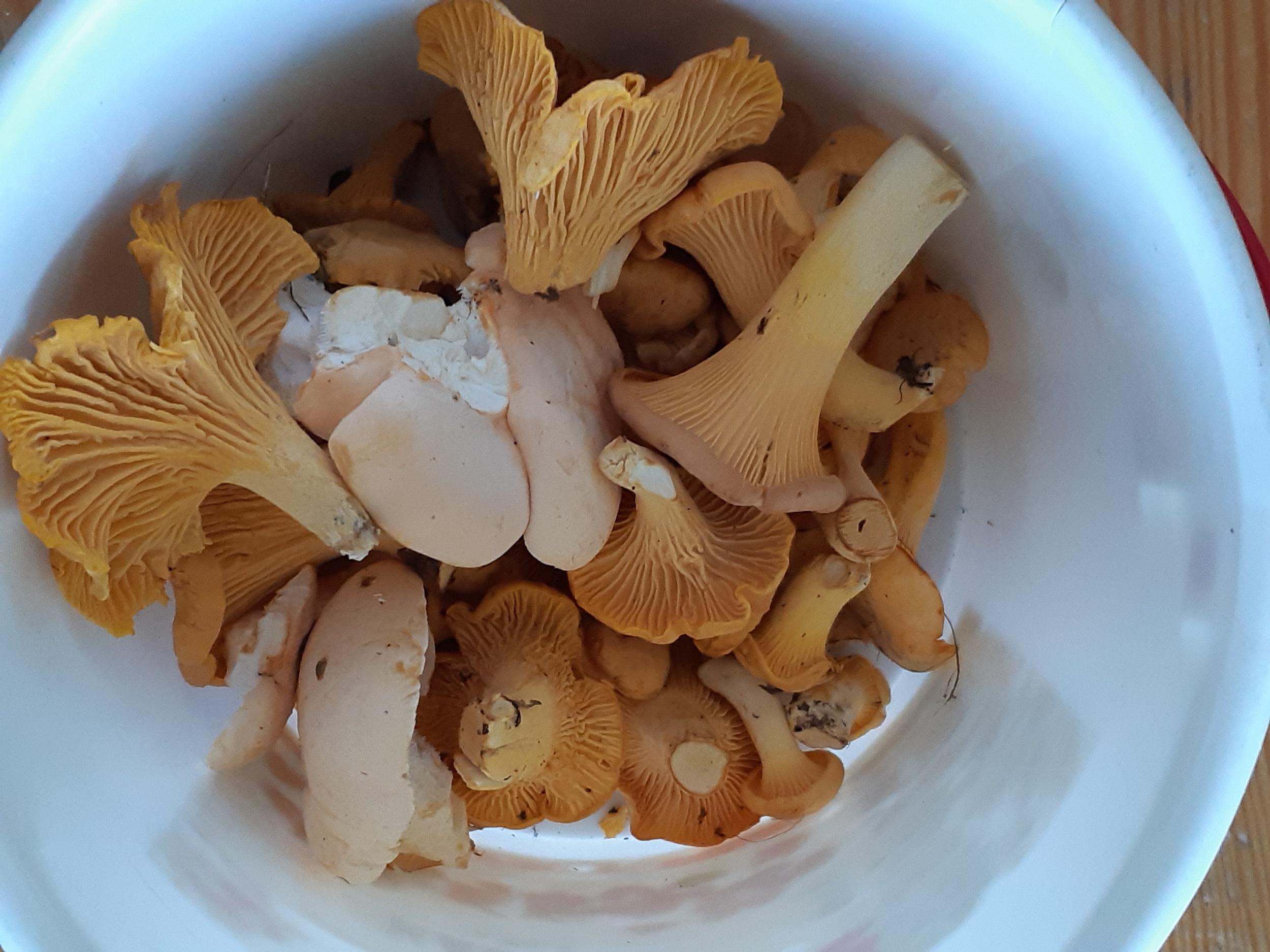 Nu har kantarellerna börjat visa sig ovan jord i norr efter denna torra sommar som vi har haft i år. Drygt 1/2 l blev det samt 2 blek taggsvamp.