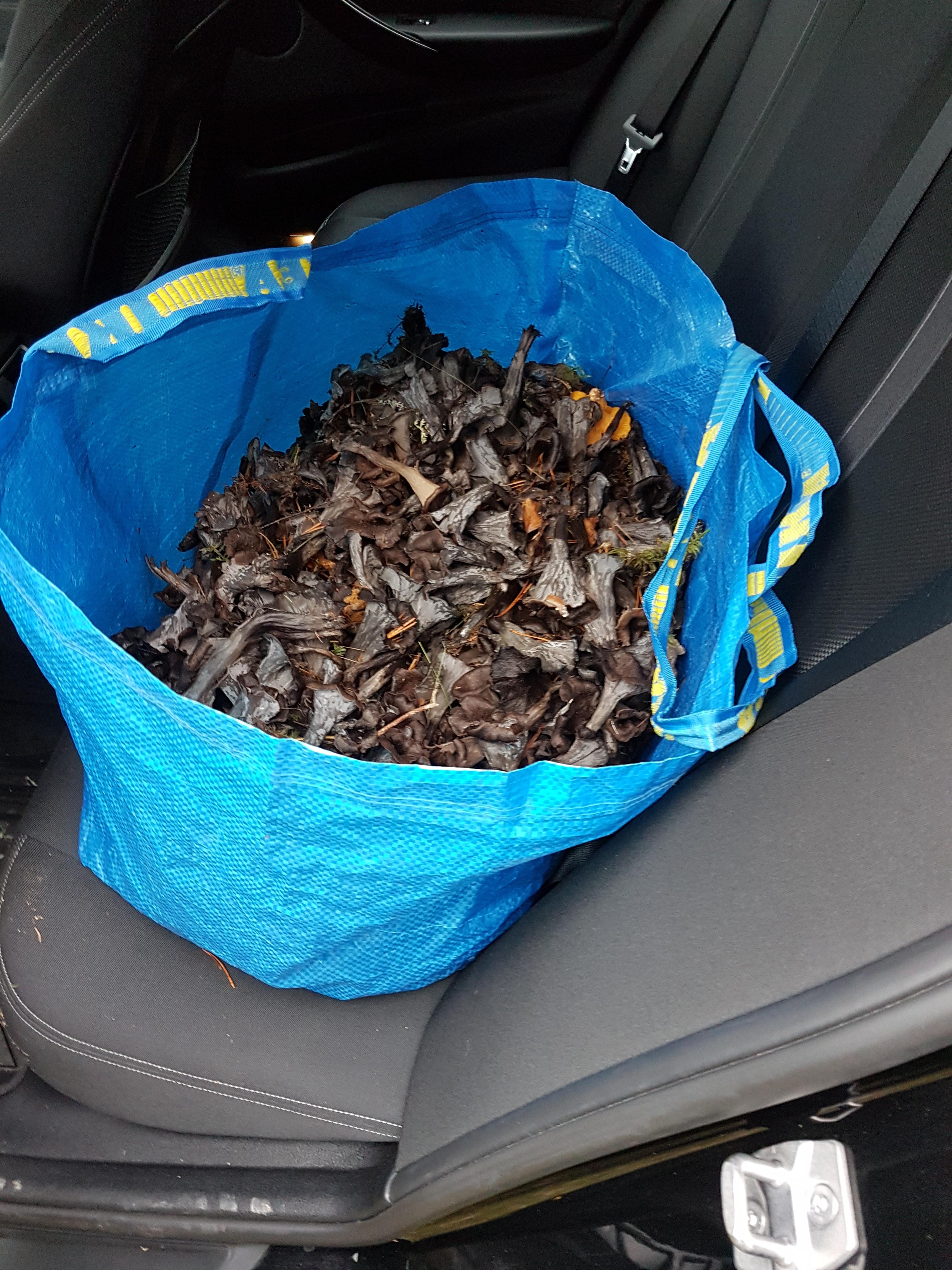 • 12 kg svart trumpetsvamp idag, fyllde nästan en ikeakasse. /M