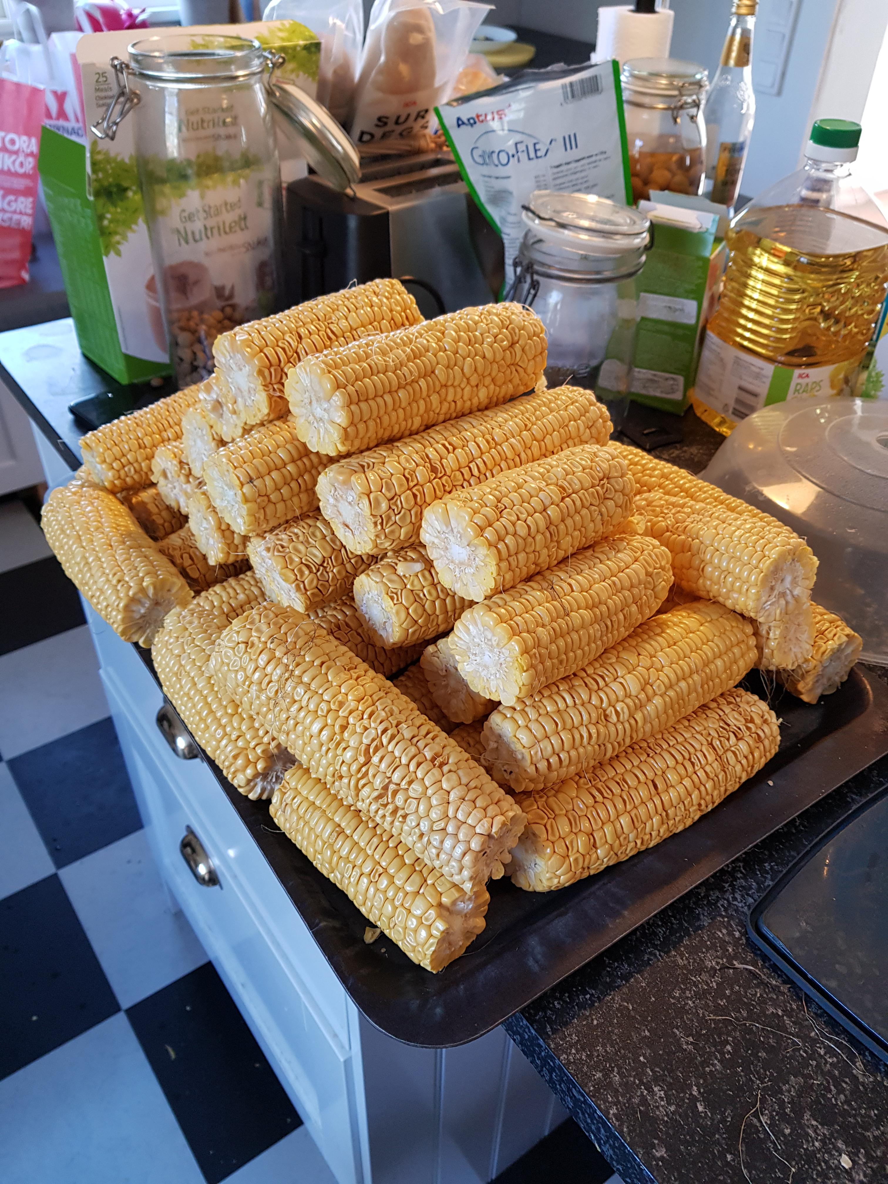 Även rivit, avvattnat (med potatispress) och paketerat 18 kg sommarsquash och i em ska vi plocka och förvälla majsen innan även de hamnar i frysen.