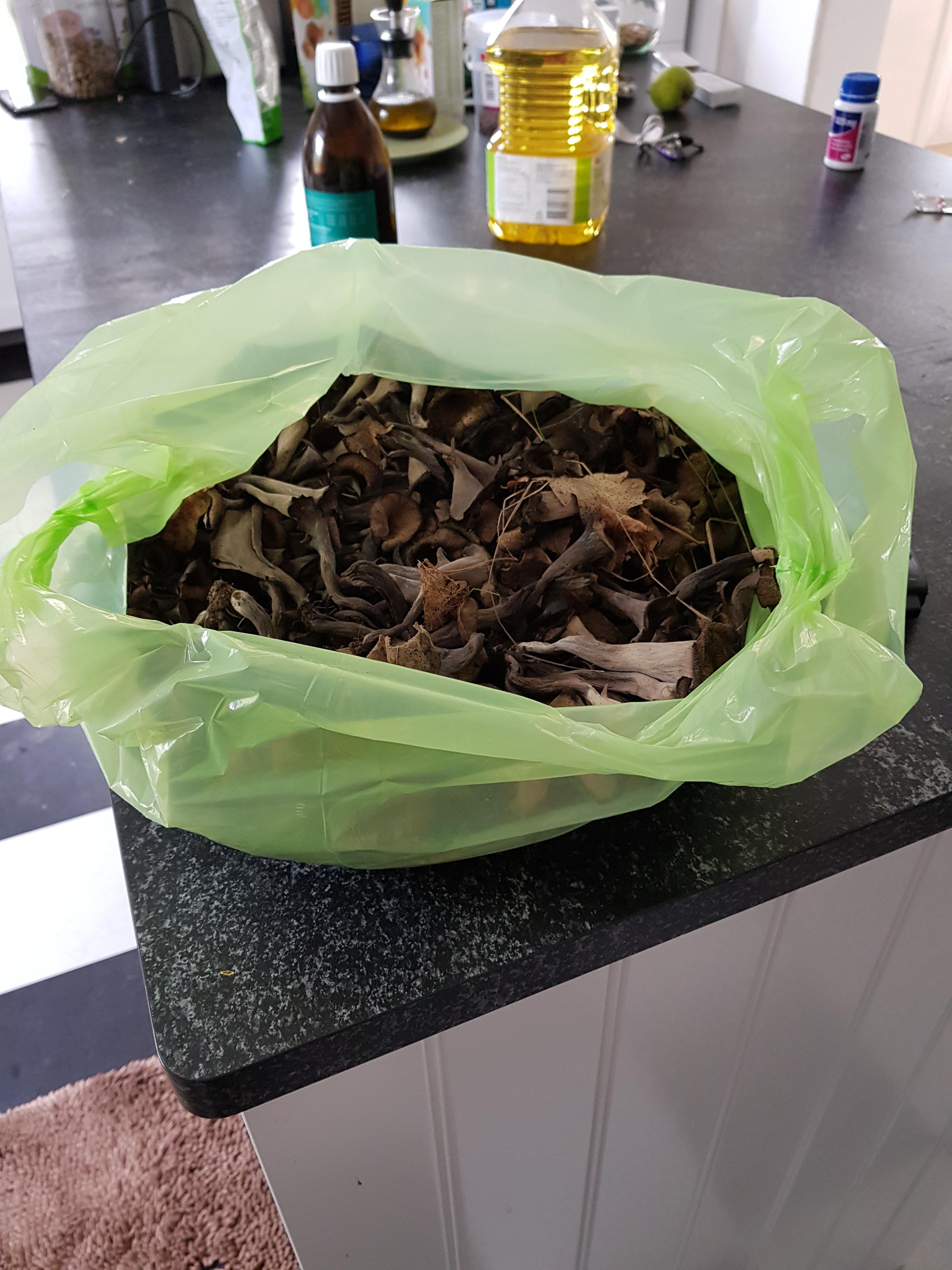 • 12 kg svart trumpetsvamp idag, fyllde nästan en ikeakasse. /M