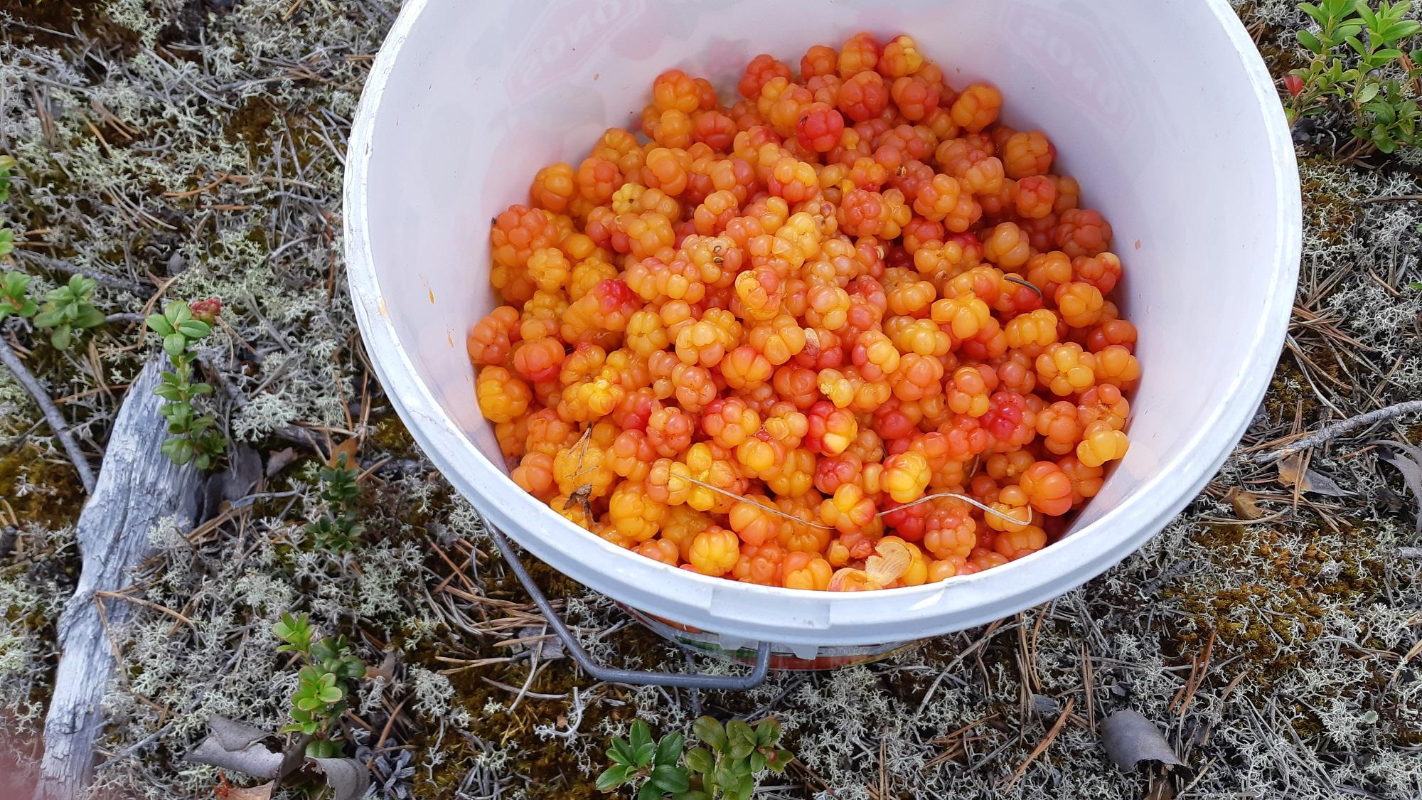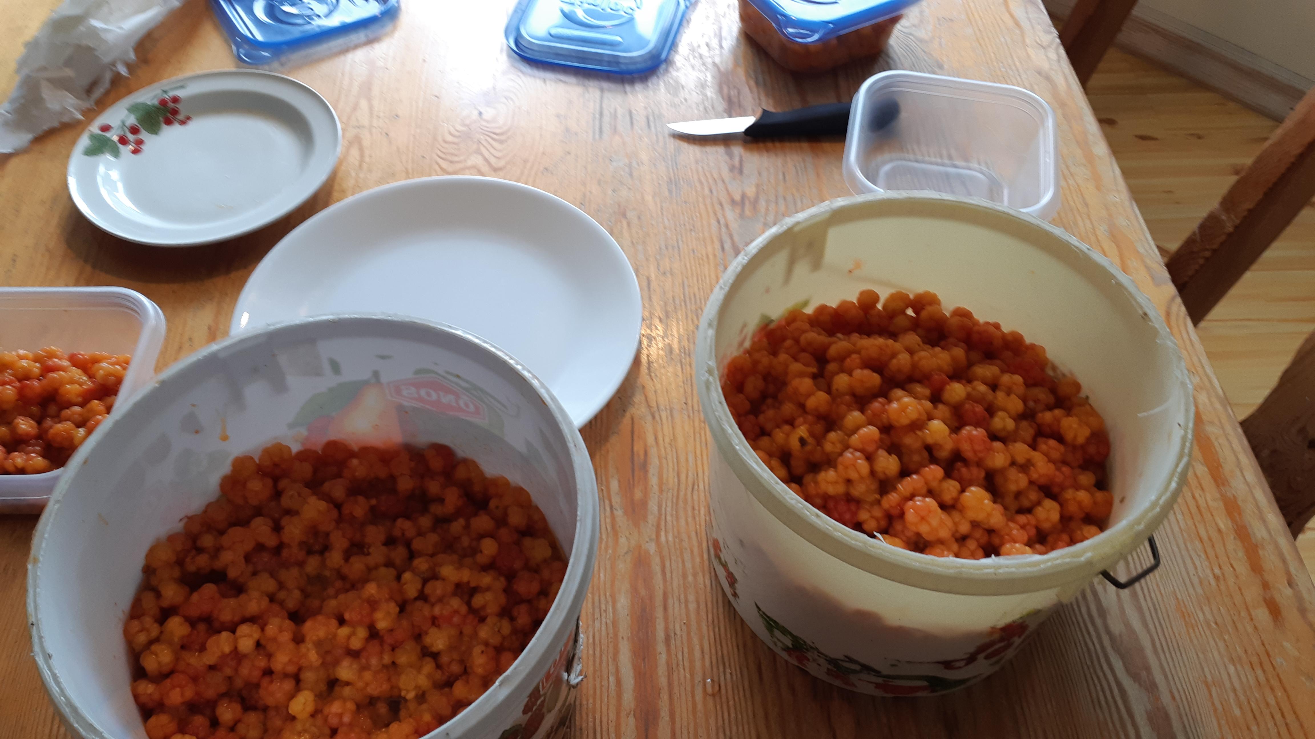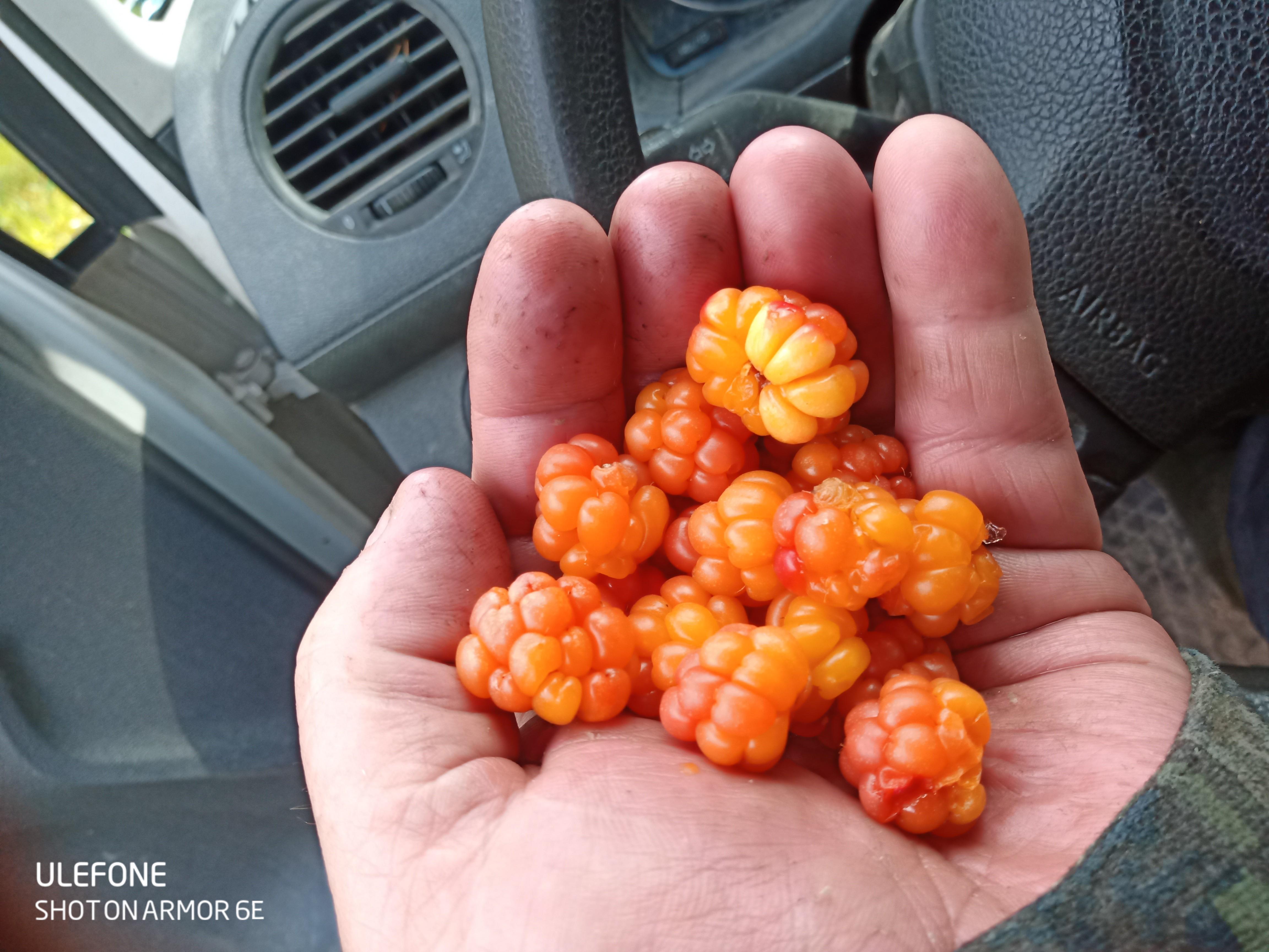 Det blev ca 7 l hjortron idag på samma myr som i torsdags på ca 3,5 tim. Mindre moget än vad jag hade räknat med annars var det fina bär och nu är allt rensat o i frysen.