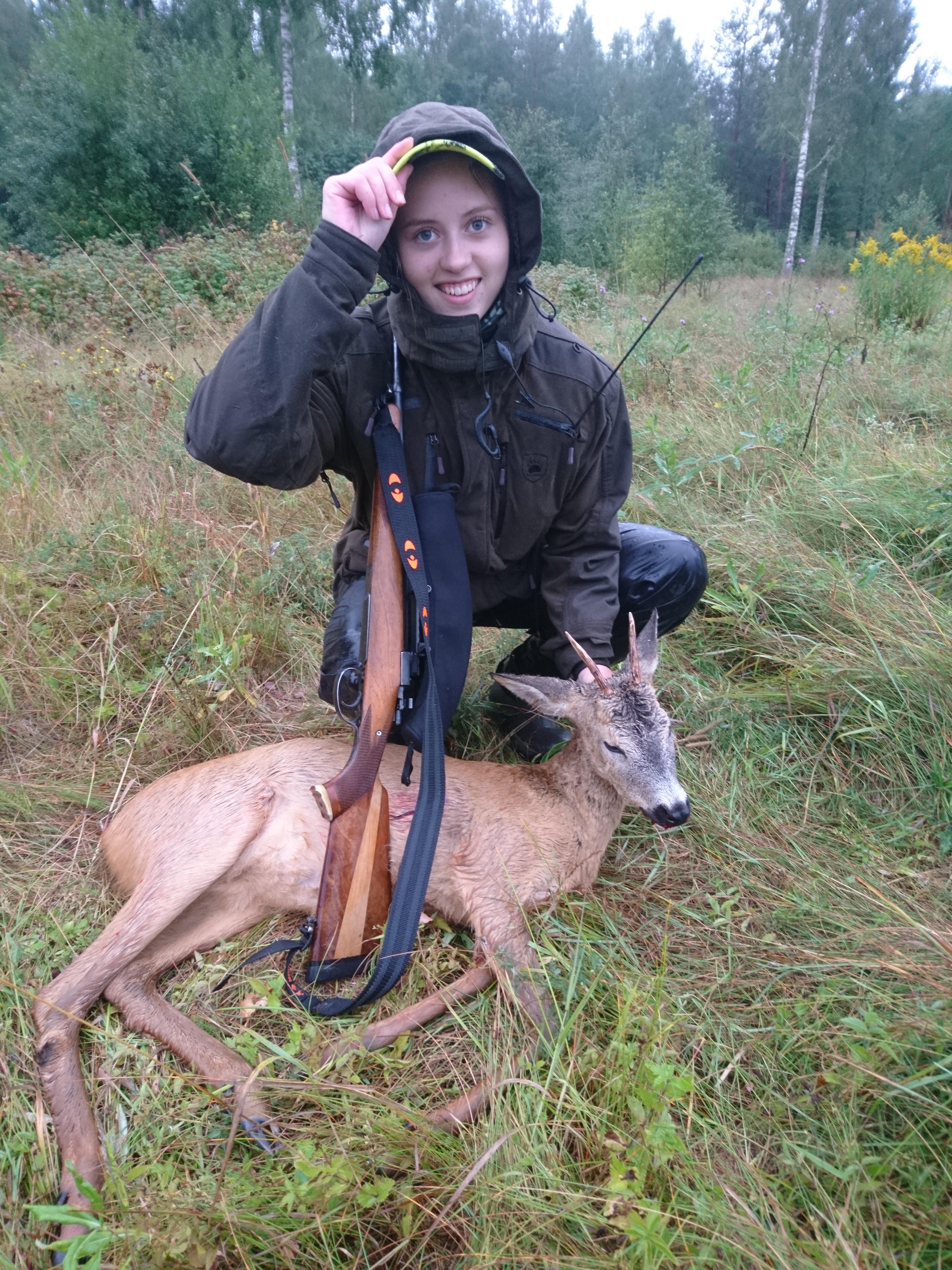 Publicerat Augusti 20, 20178 yr Detta är en populär post. Satt i ett torn på ett hygge, räknade med att rådjur skulle komma ut ur skogen öster om mig. Som av en händelse vänder jag mig om och får skymten av en bock inne i skogen bakom mig, på andra sidan vägen. Lockade och lockade men inget hände. Ett smaldjur dyker upp till vänster om där jag sett bocken. Efter en stund går smaldjuret över vägen söder om mig. Plötsligt går även bocken över vägen, jag ser den i några sekunder innan den försvinner in i bland björksly och ormbunkar. Avvaktade en minut och lockade lite och han kom med väldig fart rakt emot mig. Han gjorde en kullerbytta vid träffen, sprang över vägen igen och in i den täta björkslyn under kraftledningen och är borta. Kollar lite där han gått över vägen och ser blodstänk. Jag gick och hämtade Ziva, en strävhårig vorsthe och hon spårade 40 meter i den täta björkslyn och där låg han. Hade aldrig hittat honom utan hund. Det som slog mig var är hur mycket man hinner tänka under några få sekunder innan man skjuter. I detta fall handlade det om två-tre sekunder och jag hann bearbeta ett antal parametrar innan jag sköt. Han stod ganska snett och jag beräknade att jag inte skulle få något bättre läge, då jag satt i ett helt öppet torn. Jag insåg att det skulle bli en träff som skulle gå snett och passera mellangärdet. Jag beräknade även vinkeln i höjdled för kulan. Jag hann även med att fundera på var smaldjuret hade tagit vägen så inte hon skulle träffas av genomslaget. Jag konstaterade att skjutfältet var fritt och då tryckte jag av.