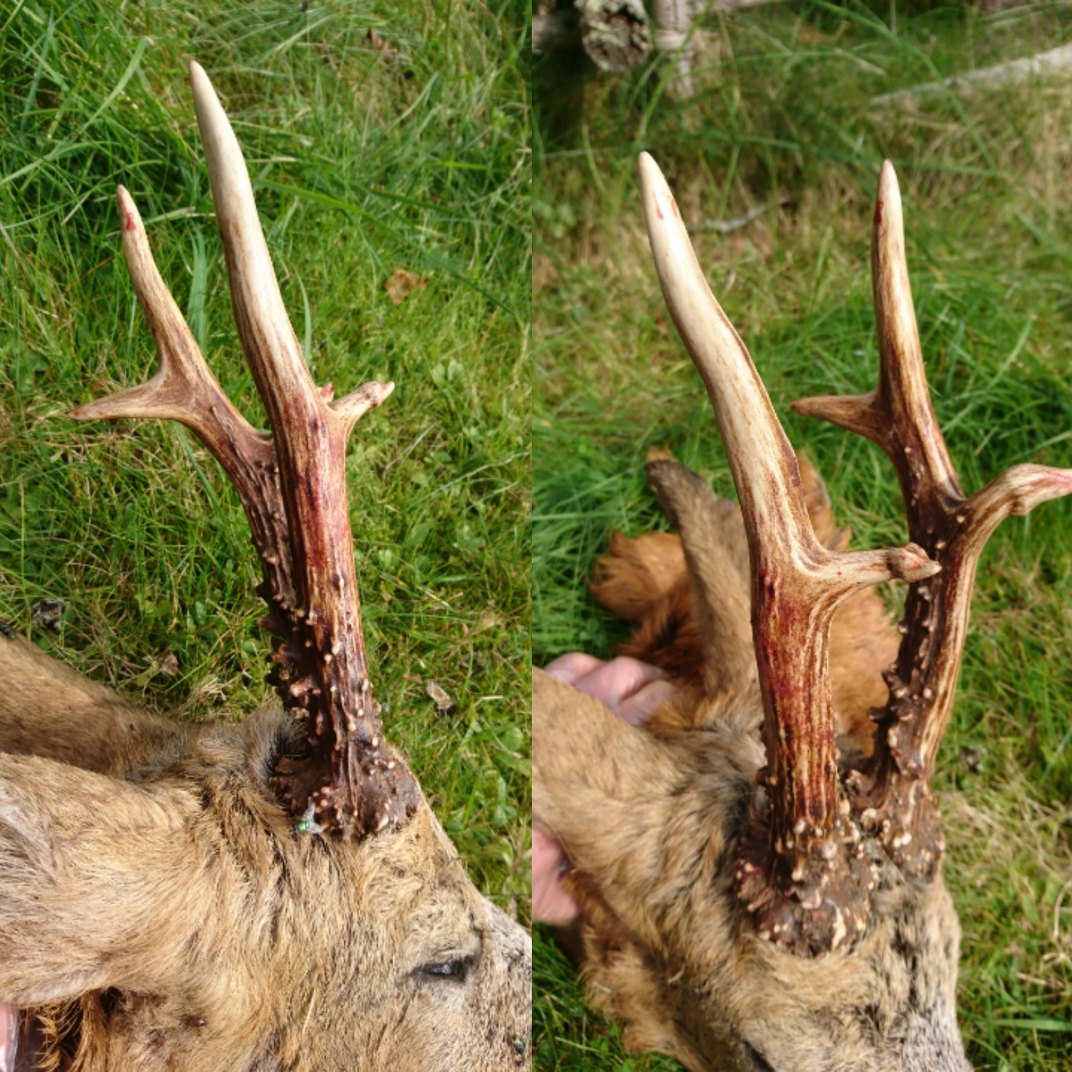 Publicerat Augusti 18, 20178 yr Detta är en populär post. Ber om ursäkt om detta blir ett långt inlägg men med handen på hjärtat, hur många gånger skjuter man en sån här bock.. Om jag ska försöka göra rätt för mig så att även ni kan försöka fantisera er in i hur en ung påg lyckades skjuta en sådan vacker skapelse. Innan jag börjar kan jag också säga att det här med att det är så mycket enklare att jaga efter bockar på åkermark jämfört med skogsmark har nog inte jagat på samma sätt som jag gör. Det vill säga, jag skjuter aldrig på långa avstånd, vissa fält står otröskade och det finns något som heter björnlokor. Sedan finns det en otrolig viltmängd som fler än en gång avslöjat ens framfart. Detta är min uppfattning och andra får gärna stå fast vid sin dock, detta som skapar diskussioner så att ett sånt här forum blir använt. Nåväl. Denna bocken är ingen ny bekantskap utan jag har följt han i gott och väl tre år. Förra året såg jag honom som den "sibiriska råbocken" för hans jäkla utlägg precis som sin far som hade namnet "Kungen". I år kände jag när jag först såg honom i maj att detta är herren på täppan. Den 16 augusti hade jag planerna på att smyga ner där jag sett honom tillsammans med get och kid tre dagar tidigare. Detta är då 800 meter från var jag sett honom hela sommaren. Jag ser en jäkla massa rådjur av olika kvalisorter men ingen sibirisk råbock syntes. Jag smög runt till den andra delen där jag sett honom men ingenstans stod han. Vid kvart i 8 på premiärmorgonen får jag syn på honom på 250 meter och beslutar mig för att försöka smyga runt, när jag kom runt var han borta och tristessen tillsammans med den snurrande vinden gjorde att jag beslutade för att smyga rakt på där jag egentligen inombords visste att han låg. Mycket väl, han reste sig ur björnlokorna och sprang utan att ens försöka stanna någonstans. På kvällen gav jag mig ut och såg han ganska omgående betandes utan kulfång på ca 100meter. Jag satte mig ner i åkerbönorna men vinden låg snett mot honom och han gav sig iväg mitt ut på fältet och jag satte mig ner och hoppades på att han skulle komma lite senare då detta fortfarande var tidigt på kvällen. Precis som på morgonen syntes get med kid, get med dubbelkid, ett ensamt hondjur samt en lovande bock sig. Den sibiriska råbocken var borta. Jag avstod morgonen efter från att jaga i tron om att han skulle slå av lite på sin vakt, naivt jag vet. På kvällen visade DMI, YR samt SMHI att vinden skulle ligga bra till så jag tänkte ge det ett försök även om det blåste och skulle regna. Jag smyger förbi get och kid genom att krypa 250meter i en bönåker. När jag sedan lyckas sätta mig ganska bra så ser jag en bock som nog för många skulle ses som en avskjutningsbock men jag tycker att han har mer att ge på denna jord så han fick gå. Regnet kom och jag beslutade mig för att smyga tillbaka lite i tron om att han rörde sig i området där jag stötte han kvällen innan. När jag kommer upp på en liten höjd så ställer jag mig lite tröstlöst och kikarspanar och får se två mycket välkända hornstänger sticka upp ur bönåkern 250 meter bort mot där jag först satt på pass. Han är oerhört vaksam även om vinden är stabil och i säker riktning. Jag sätter mig ner på alla fyra och försöker lista ut en plan. Vart är han på väg, finns det fler djur med honom, finns det fler djur mellan oss, finns det någon låg punkt där jag kan gå i skydd. Nej det här blir svårt.. Ett par rådjursöron sticker upp vid sidan om bocken och det är ingen lämplig dal som jag kan smyga i utan att riskera vittring för bocken. Jag börjar åla mig fram, genom midjehögt fjolårsgräs blandat med tistlar och åkerbönor. Det är blött, jag ser nästan ingenting i handkikaren eller i kikarsiktet. Regnet duggar kraftigt från himmeln och gräset lägger sig som ett täcke när jag försöker krypa medelst åla mig fram rakt mot bocken. Nu är jag hundra meter ifrån, ett skott är inte att tänka på, ser bara halsen och dessutom inget kulfång. Jag ålar lite till och får komma upp i bönorna mer för att inte riskera en kastvind. 50 meter, nu börjar jag bli nöjd och bocken och geten är oroliga. Jag sätter mig och väntar lite så får jag se vad deras nästa drag är. Helt plötsligt ställer sig bocken i bönkanten med kulfång bakom, jag tar upp bössan och tittar i zeissen... Gräs. Bocken rycker till och springer helt plötsligt ner för den backe jag nästan kommit ända upp på. Jag stelnar till och försöker lokalisera den igen och ser omgående ett rådjur som på bara sex meter kommer gåendes. Pulsen stiger igen. En get.. FAN! Men vänta där kommer ett djur till, pulsen stiger. En kidde... FAN!! Vart fan tog bocken vägen, hinner jag tänka innan jag ser bocken 30 meter ifrån mig med full bredsida och bra kulfång. I periferin märker jag att geten och kidden hoppar iväg. Bocken stirrar stelt mot mitt håll, hornkronan gör mig skakig. Jag känner hur min Tikka continental med benstöd blir jävligt tung och att den måste titta bort snart annars måste jag ta ner bössan och chansen kommer vara över. Så gör den det äntligen och jag smyger upp bössan, tittar i kikarsiktet och ... Gräs... Jag känner att goda råd är dyra och känner att jag börjar hamna ner i stresskonan vilket är ganska ovanligt. Jag sätter mig på smalbenen så att säga och får skippa stödet. Bocken tittar då tillbaka mot mig och jag inser att nu har den sett mig, en del gräs är framför bocken men jag ser ryggen och tillräckligt mycket för att lista ut var jag ska sikta och trycker av. Skottet kändes bra, men krumryggad lunkar bocken 15 meter och jag gör mig redo att skjuta igen. Men jag får inget läge innan den trillar ihop död i björnlokorna. Vilken glädje när jag kommer fram och ser denna otroligt vaksamma och respektingiva