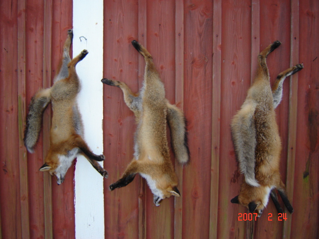 Publicerat Januari 13, 200719 yr kul att du fick en räv. Bor du på samma gård.? Nope, arbetar på gården. Det lustiga i sammanhanget är att vi har ett gårdsslakteri i en annan byggnad och där jag bergsäkert trodde att räven skulle gå så jag byggde en vakkoja ovanpå slakteriet. Men nu när snön kom visade det sig att rävarna hellre drar sig runt svinstallarna med tillhörande dynghögar så igår blev det lite brått med iordningställande av ny vakkoja, iofs bara en provisorisk sådan. Vid ena skulluckan är en *fyrkant* uppreglad då det suttit en elevator där tidigare så jag tog bara filtar och täcken och klädde in ett litet vakrum, förminskade också gluggen med virke och filtar och det räckte för att lura räven. Ett plus i sammanhanget är att nedanför vakgluggen har vi ett sk kadaverfack där djur som dött av olika anledningar läggs i väntan på kadaverbilen och det drar ju som sagt räv. Nu behövs det säkert tillstånd att vaka på döda tamdjur men jag kan väl inte rå för att just gluggen ligger där den ligger...