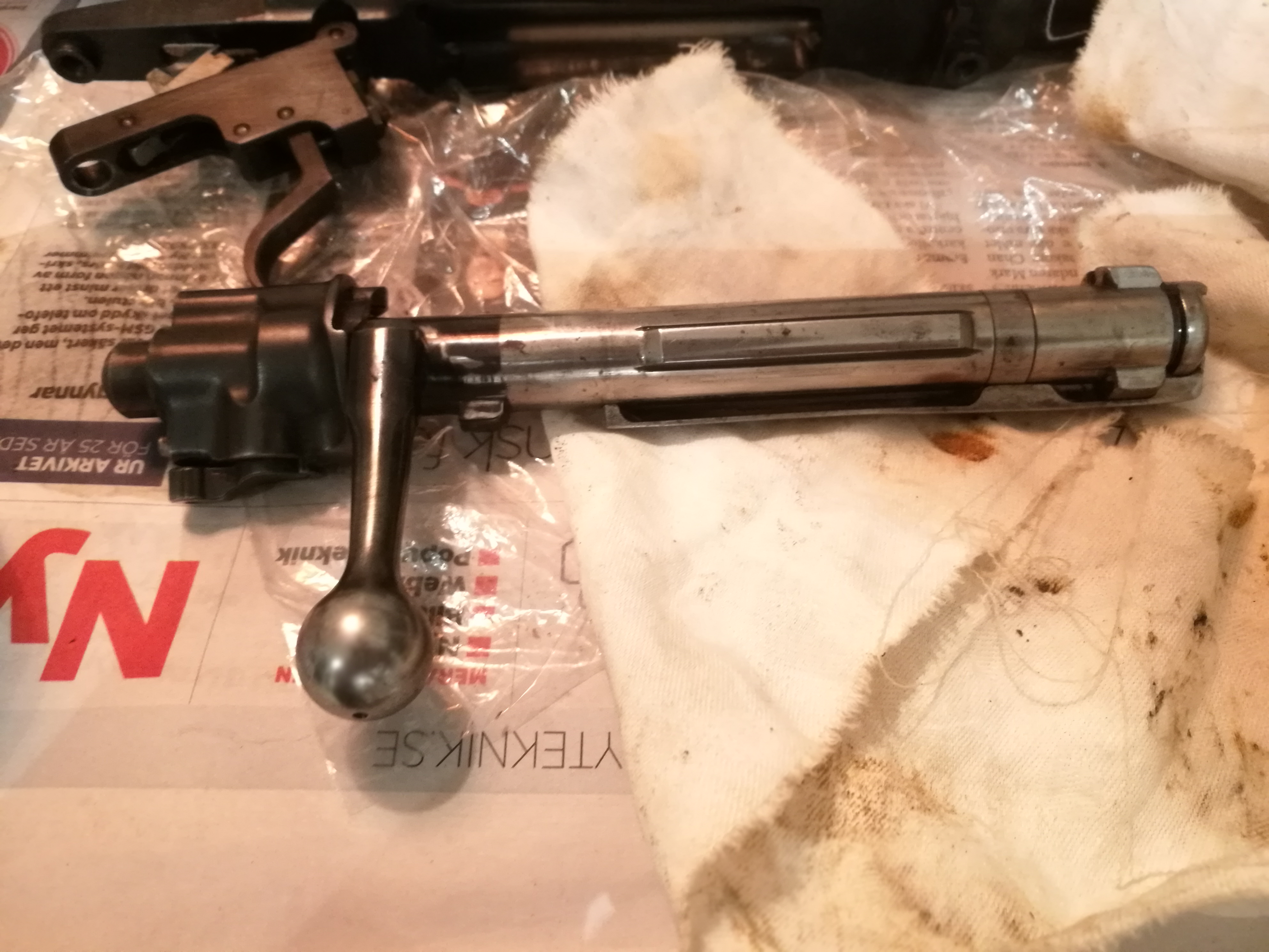 Publicerat November 23, 20178 yr Författare Hm, okej ska kika på det Kan även passa på att fråga hur svårt det egentligen är att demontera slutstycket? (Alltså fick nästan huvudvärk innan jag kom på hur jag skulle få ur slutstycket ur pipan...) Jag hittar gamla lingon, väääldigt gammalt vapenfett i alla hörn och kanter så känns som att det borde vara bra med en rejäl tvätt. Nått ska man ju göra medan man väntar på att oljan ska torka... är dock lite skraj för att plocka isär slutstycket. Vill ju få tillbaka allt.. Någon som känner igen sig? För er som vet kan också få förklara den puckade lösningen till lossningen av slutstycket (den lilla lådan/blanka skenan under kikaren) måste ju göra fel men fick skruva lös hela prylen liksom...
