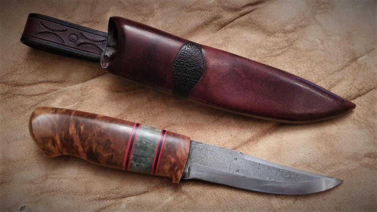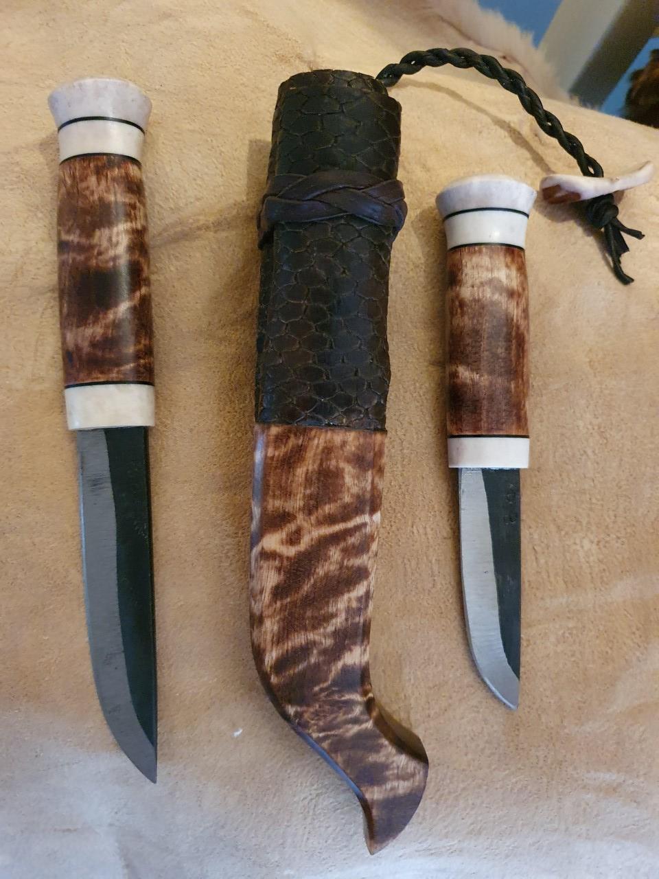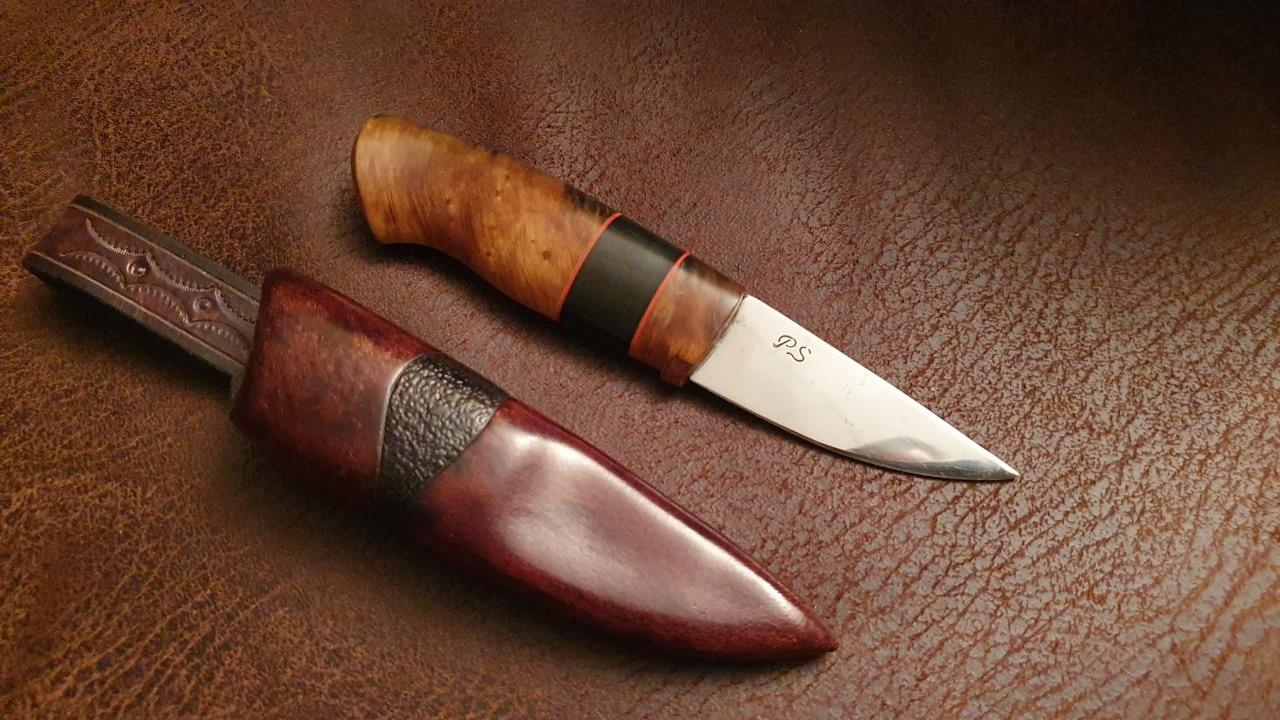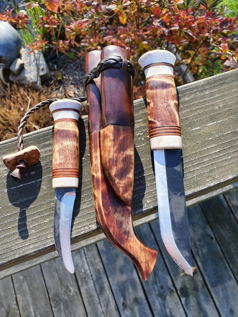 Övre kniven har skaft av stabbad björkvril i två färger.