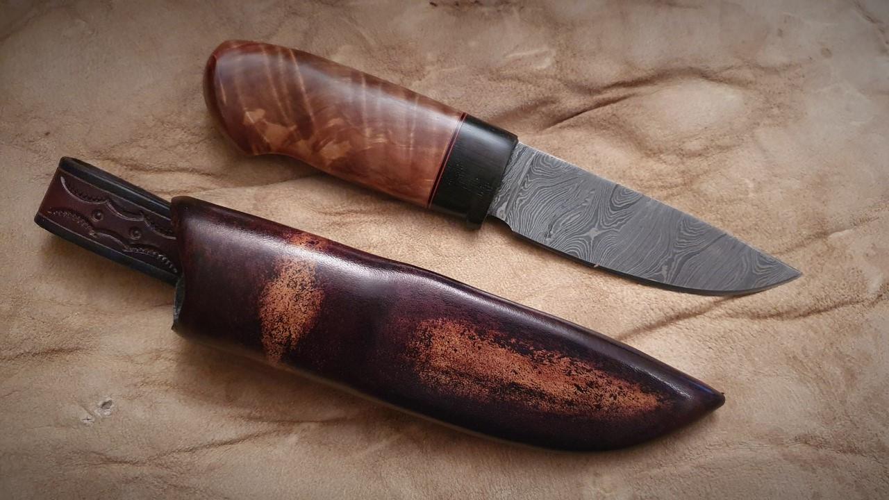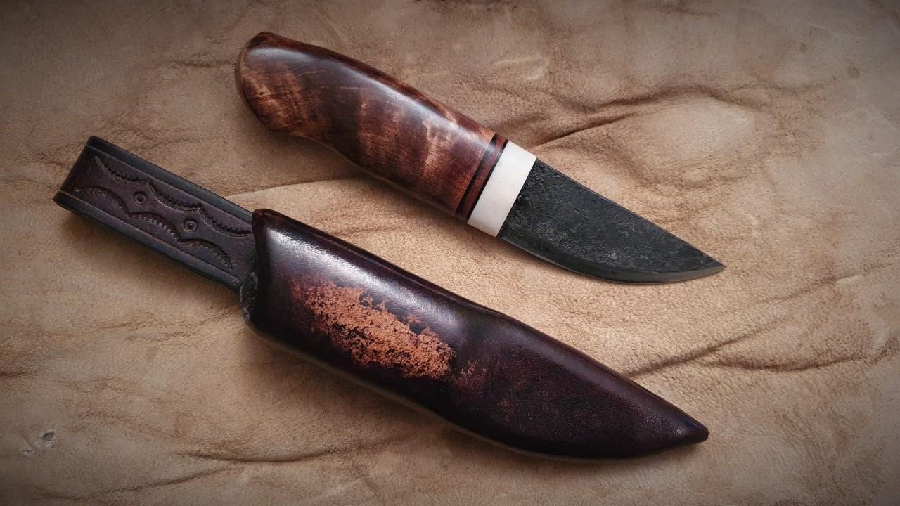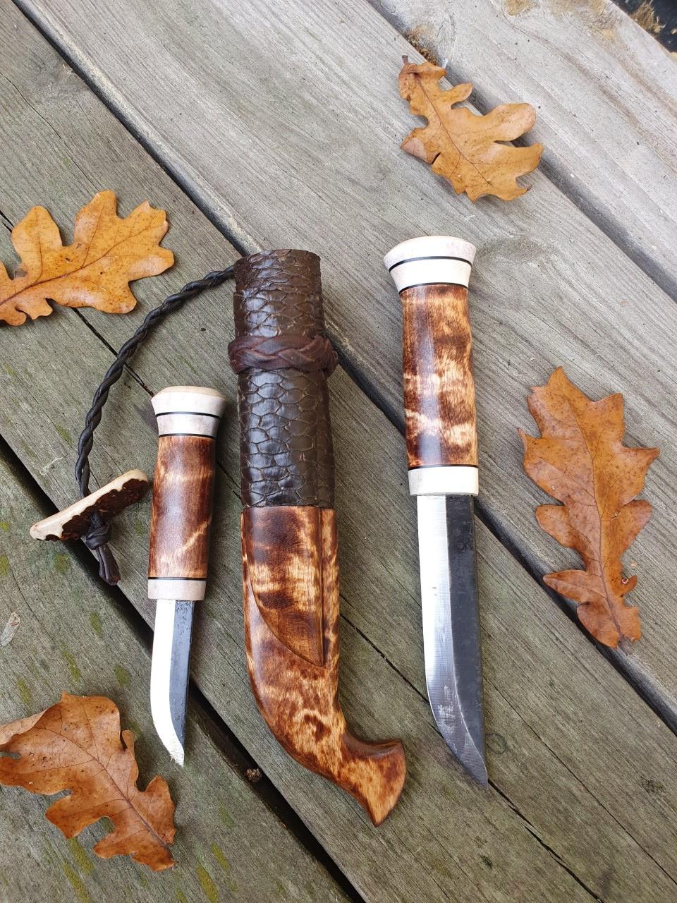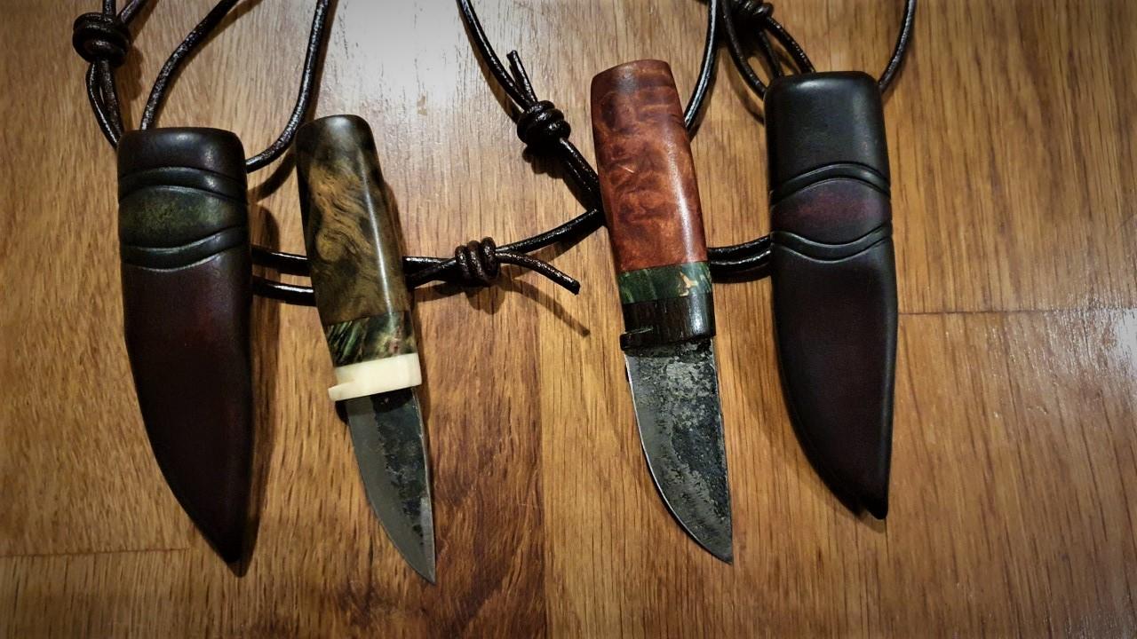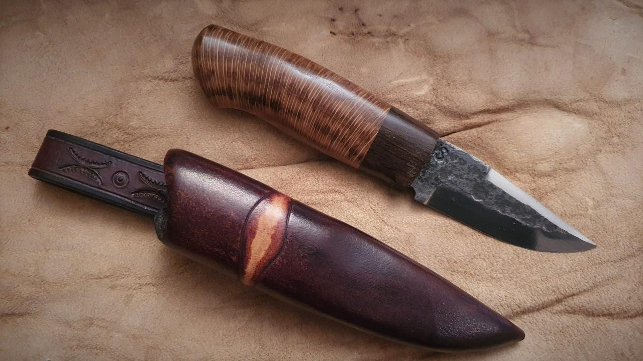 Övre kniven har skaft av stabbad björkvril i två färger.