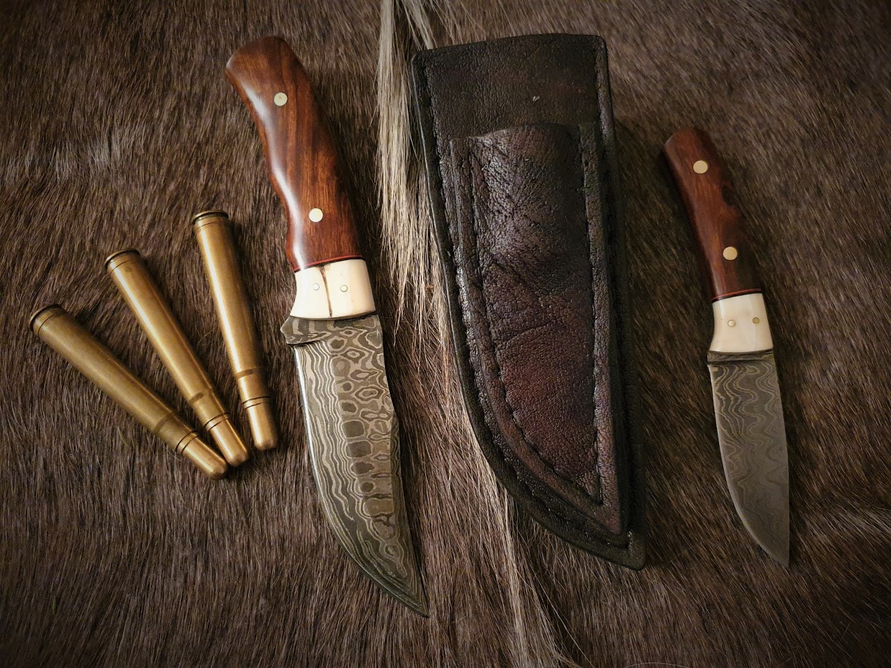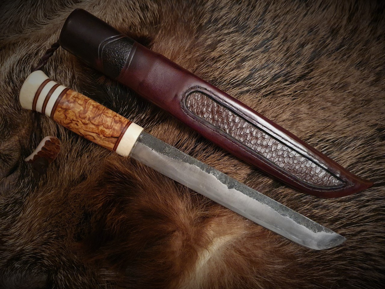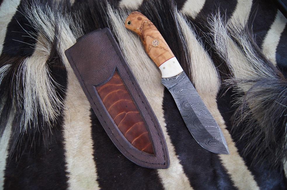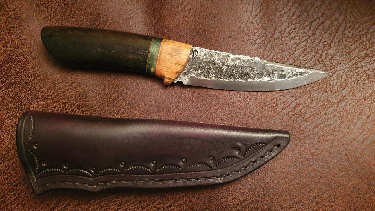 Övre kniven har skaft av stabbad björkvril i två färger.