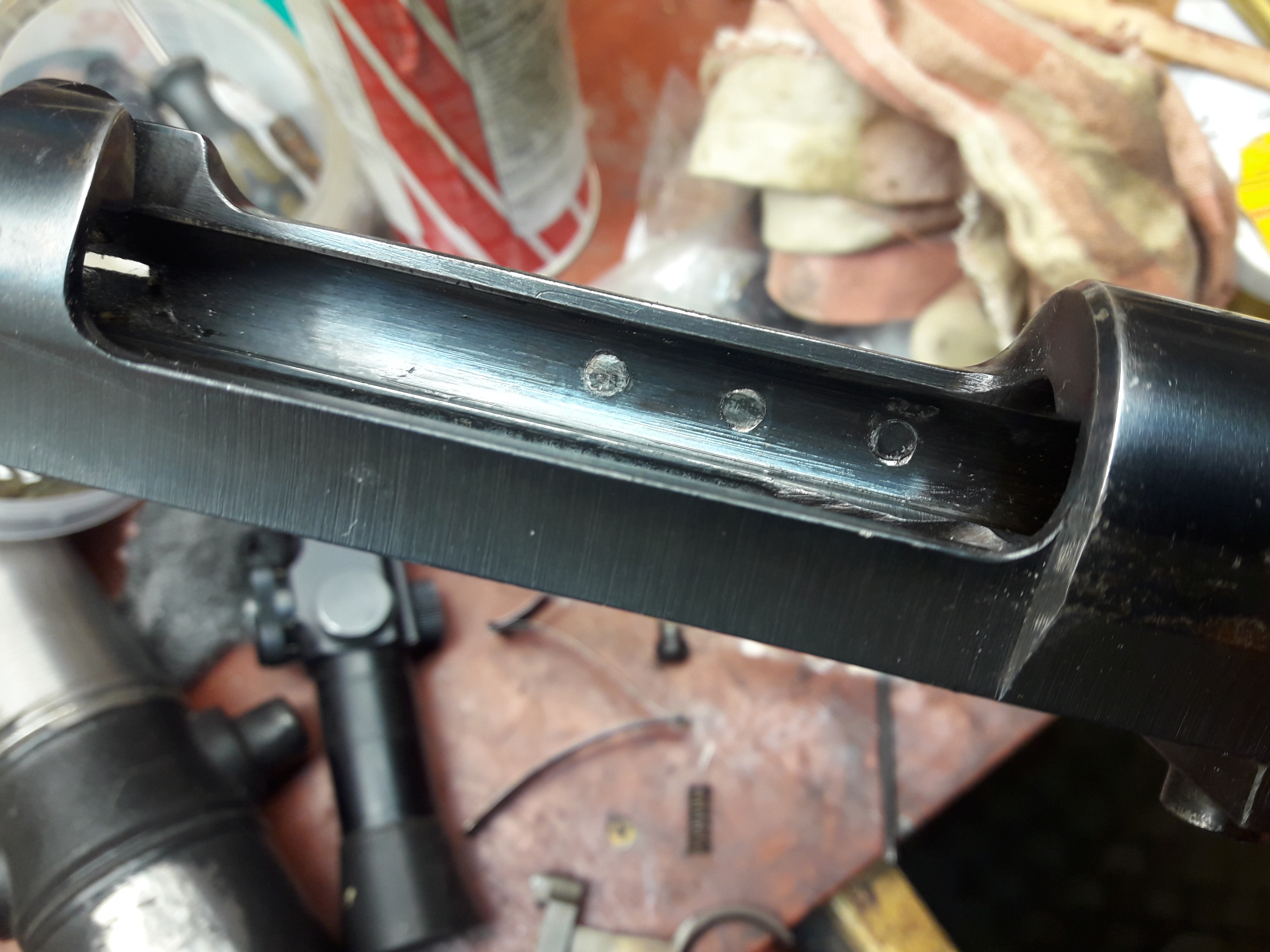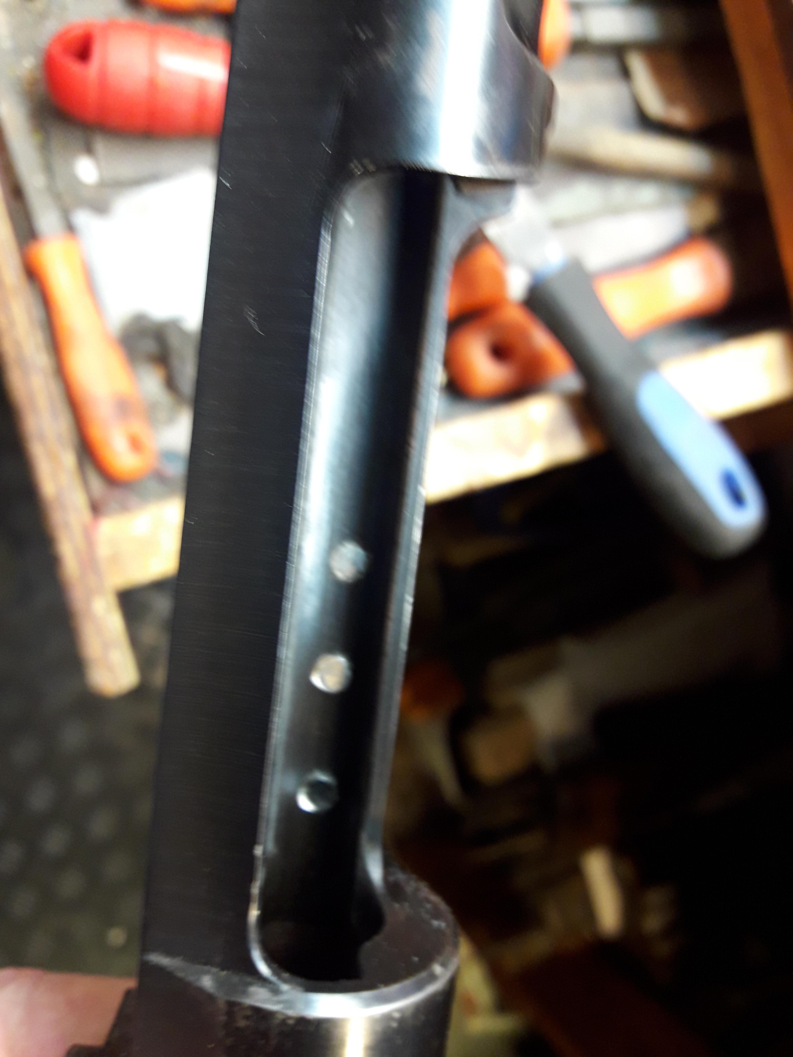Publicerat December 27, 20178 yr Detta är en populär post. Folk är "rädda" för att köpa en bra bössa som är borrat för ett sidomontage. Jag anser det vara bättre köp än en där något klantarschle har borrat (snett?) för weaverklackar: då har man friska baser att borra rakt i och behöver inte börja med att "fixa till" ett snett montage. Man får bäst resultat om han som har borrat för sidomontaget inte har gradat hålen innnan han gängade: då räcker materialet till att bli tät i skarven. Använd svart skruv- elförzinkad skruv ger en blank cirkel som man inte kan få bort. OCH KOLLA ATT LÅSKLACKEN PÅ SLUTSTYCKET INTE TAR I SKRUVARNA INNAN DU BÖRJAR NITA DOM. Man gör som så här: