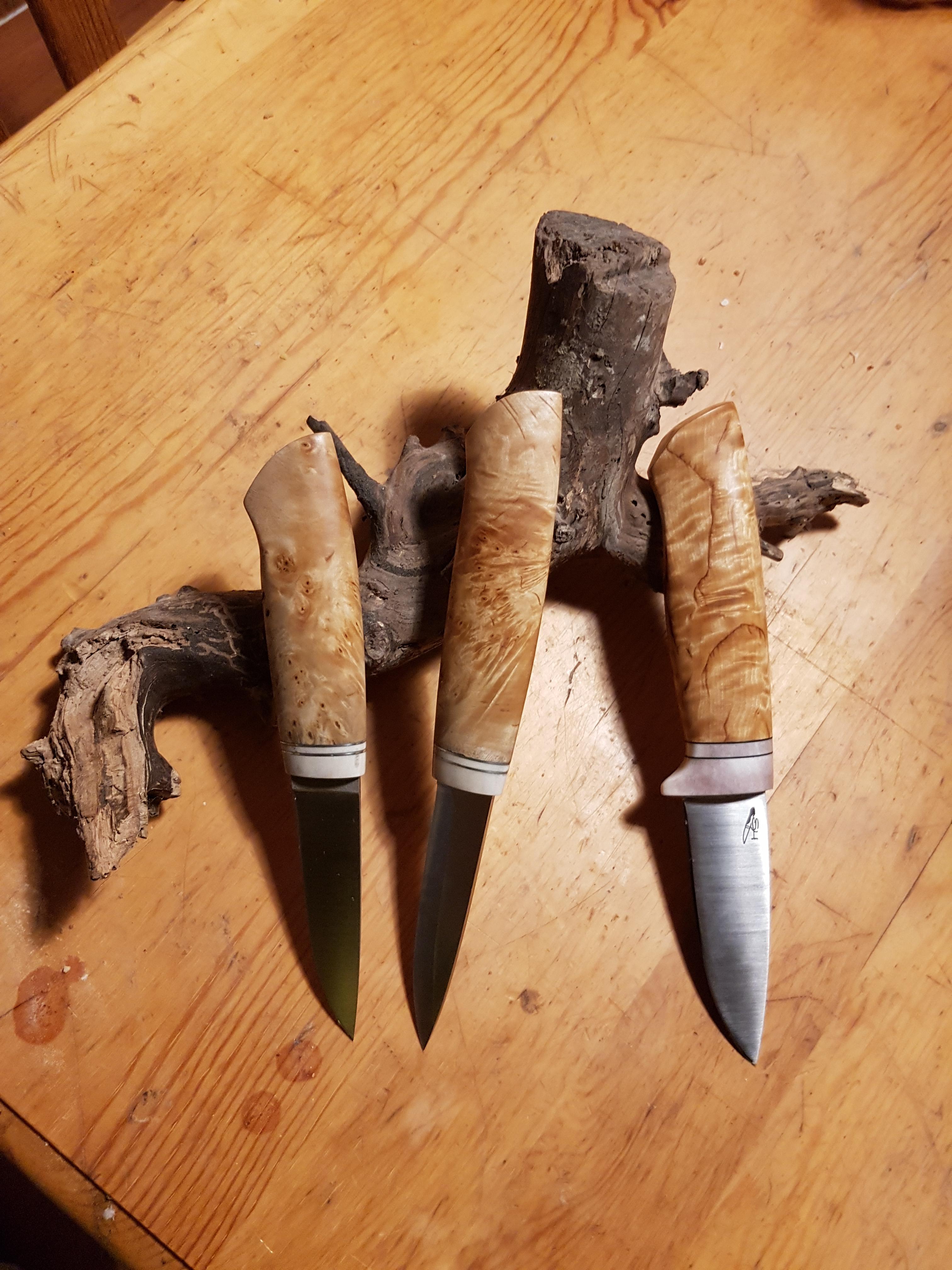 Publicerat Februari 22, 20187 yr Detta är en populär post. Tre klassiska svenska knivar om du frågar mej. Den med parer skydd är det stammasur i dom andra två rotmasur. Det är renhorn i alla tre. Parer skyddskniven är det 154 Cm stål i dom andra två är det Aeb-l stål i. Rotmasur knivarna är täljknivar till Mor och son. Den andra blir nog jaktkniv.