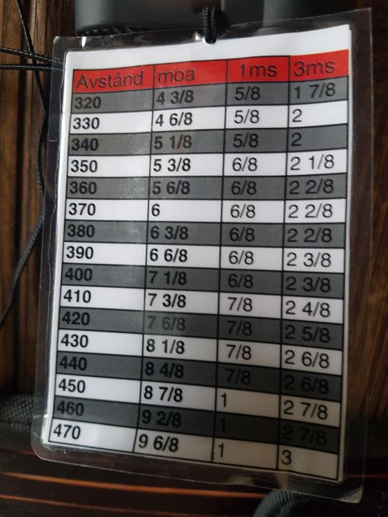 Publicerat Juni 19, 20187 yr Författare Tror de blir den som sitter där nu som får tjänstgöra tills någe nytt? En swarovski 6-24x50 Habicht PV. Som har targetrattar som går att nolla. Problemet är att den har 1/6 moa klick vilket gör de skit svårt att räkna. Har lagt in datan i Strelok men verkar upp åt väggarna fel? Hur mycket är 1/6 moa på 100m?