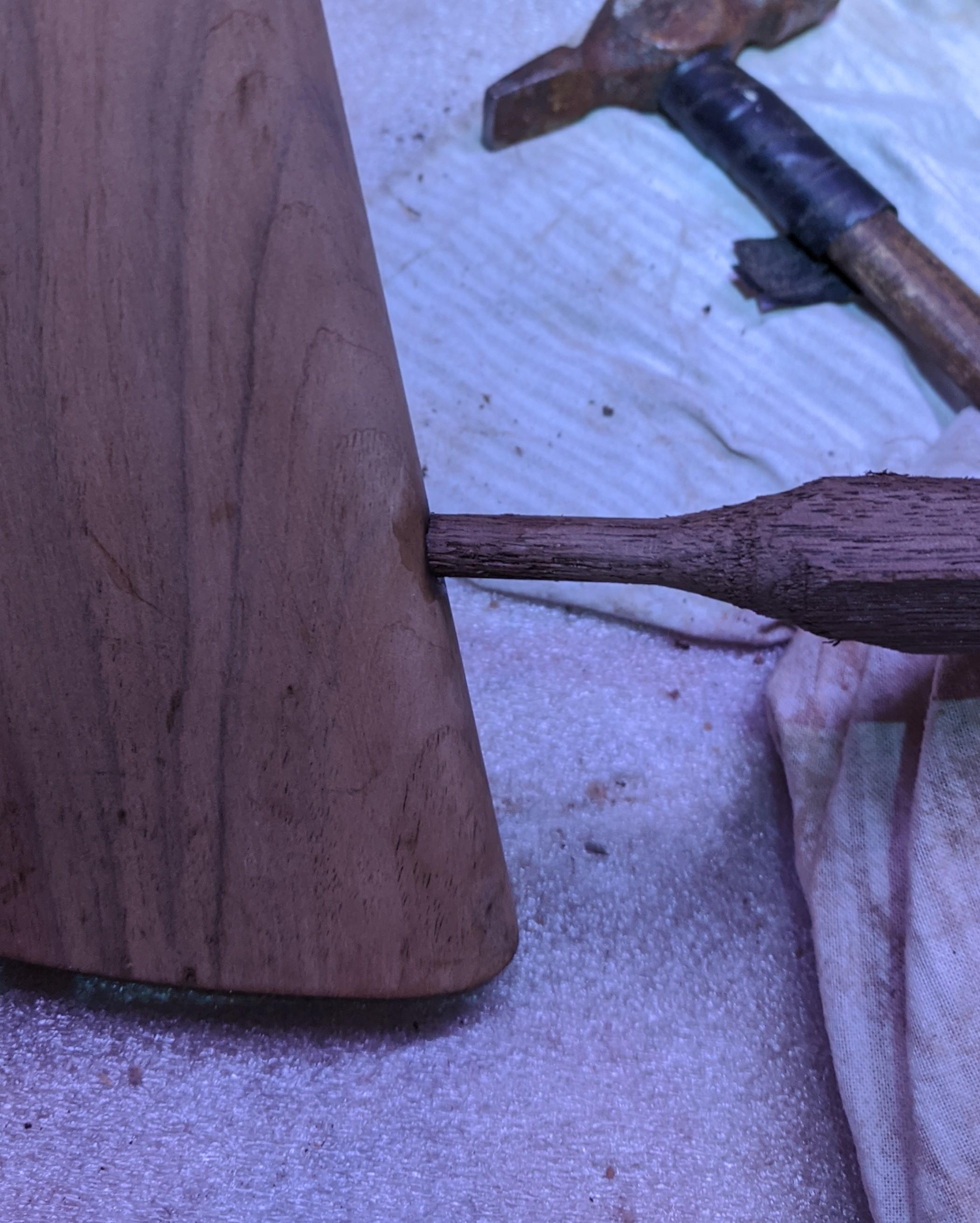 Publicerat Januari 5, 20206 yr Författare Detta är en populär post. Var ju tvungen att plugga hålet efter bakre rembygeln också... Letade lite i skräphögen tills jag hittade en bit valnöt, högg loss en speta och täljde den någorlunda trekantig i ena änden så den gick att svarva rund. Borrade ur "gängorna" i hålet i kolven, svarvade ner valnötsbiten till samma storlek som borret, skrapade med ett gammalt bågfilsblad, applicerade lim, knackade in och väntade ett dygn: Kapade av, karvade någorlunda rent med kniven och slipade ner med 120-papper och slipblock. Träbiten jag hittade var lite mörkare, dessutom är det ju ändträt som är utåt, så det kommer att bli mörkare. Fortfarande snyggare än ett hål antar jag. Sen följde jag upp resten av kolven med 180 och 240. Eftersom jag kör blött så får man en föraning om hur träbiten blir när den är färdig. Ser inte så tråkig ut som jag först trodde. /Patrik