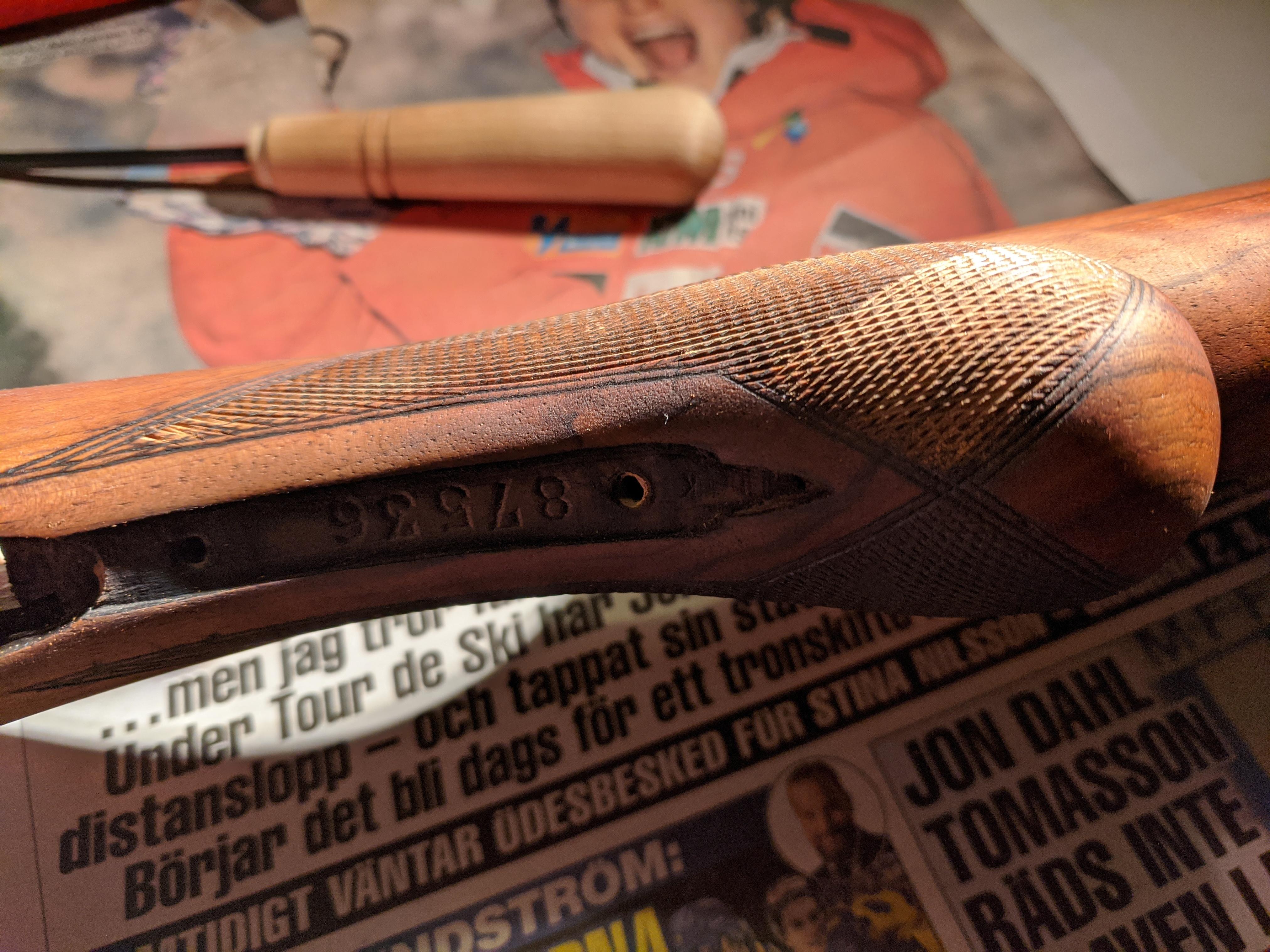 Publicerat Juni 1, 20205 yr Författare Detta är en populär post. Nästa gång ska jag börja på en slät yta, med rätt verktyg för uppgiften. (Med rätt linjedelning, så man kan använda dubbelskären som det är tänkt) Tog sin lilla tid och det blev inte perfekt överallt, men det duger åt klåparen som ska hålla i påken. Det som nu helt plötsligt blev plågsamt uppenbart är hur sliten blåneringen är, men vi väntar med det. Nu ska jag ha på några varv olja till så det blir fint att titta på och tål att hållas i.