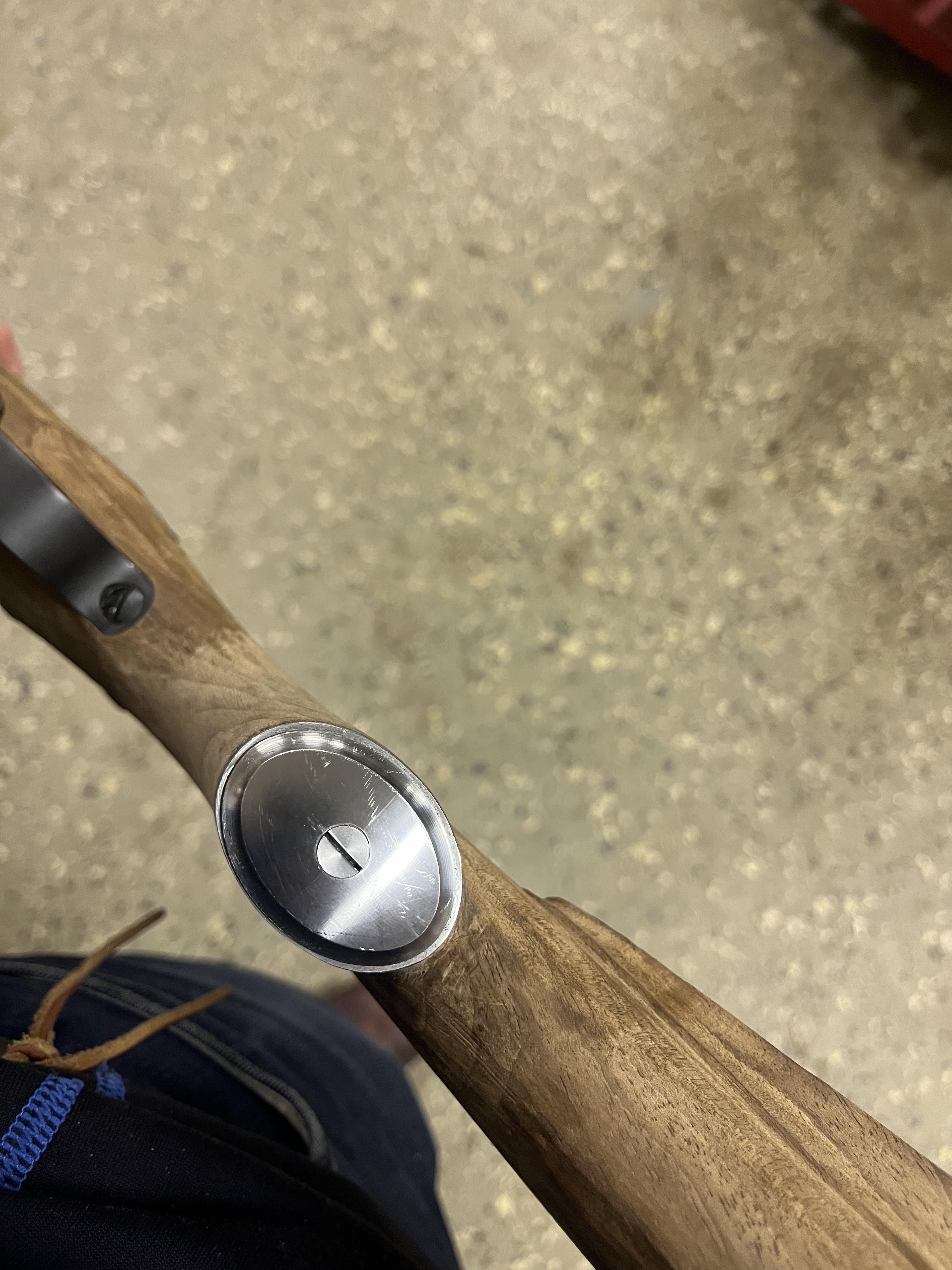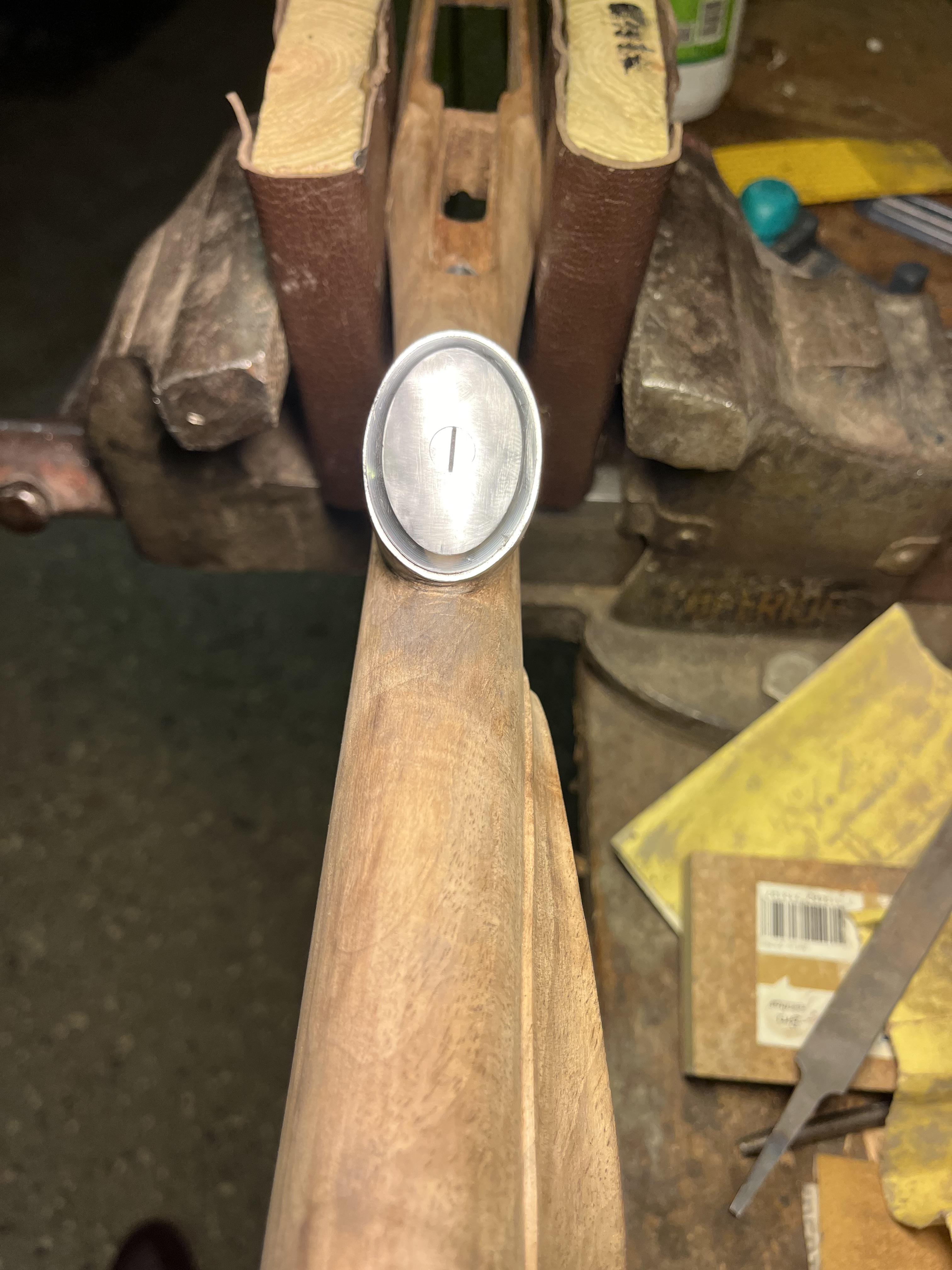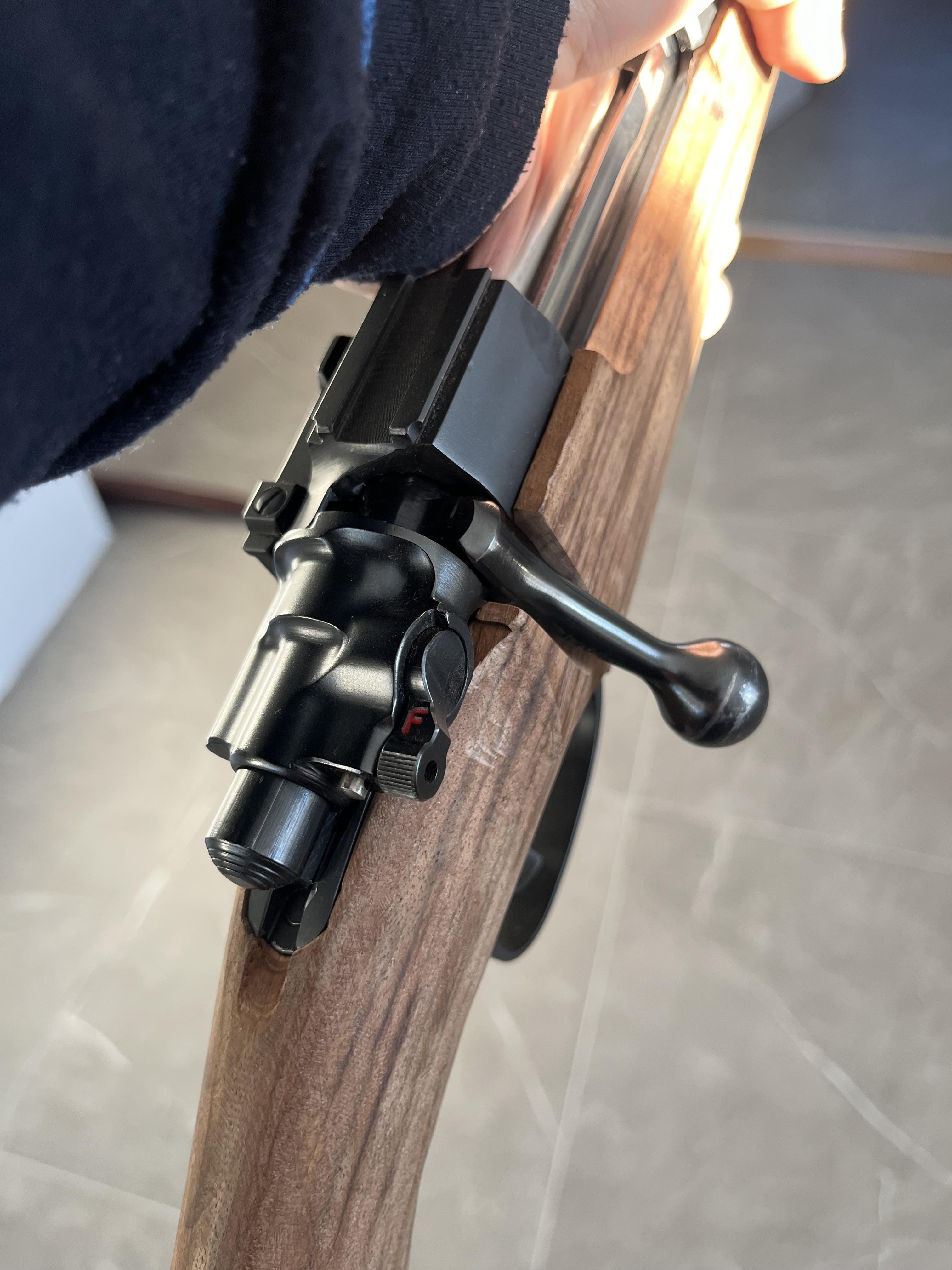 Något som prövar tålamodet och är lite tidsödande är att installera rembygelsfästen som är försänkta i kolven och sitter med två skruvar. På många kolvar där fästet i sig utgör skruven blir dess lösa med tiden eller vill snurra när det drar i remmen. Jag planerar att sätta likadana fästen på kolven till 9,3:an som till den första kolven, men dessa måste beställas då min order hos NECG inte kunde levereras. Pistolgreppsrosett har jag dock, det blir nästa steg.