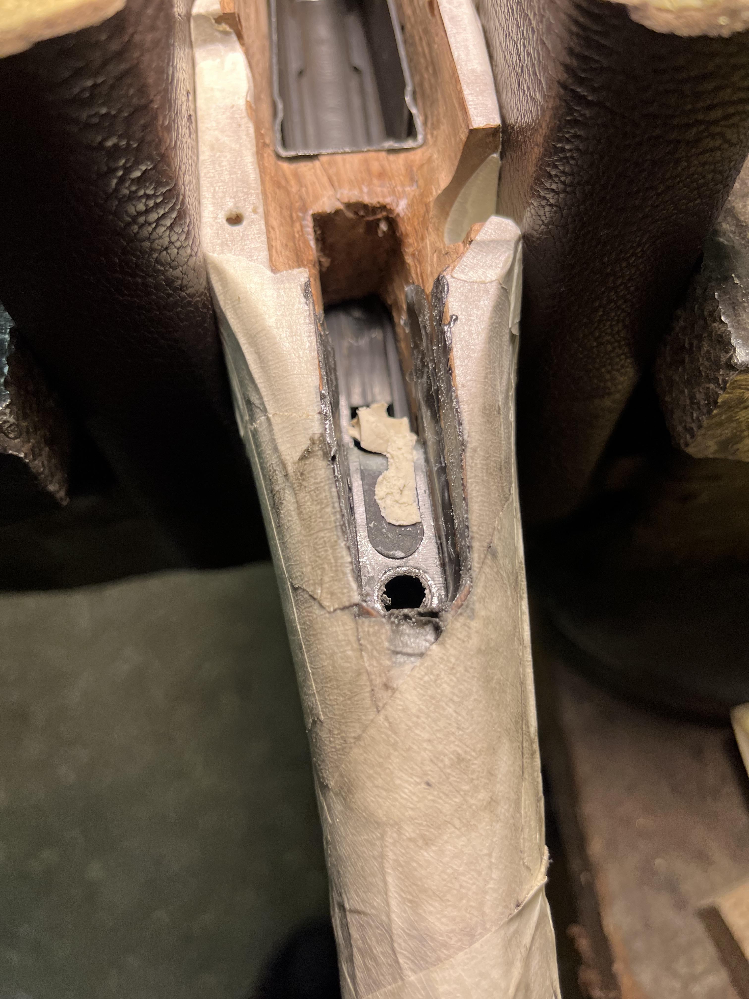 Värm med hårfön ordentligt ner i magasinet så bäddningen mjuknar något och knacka lite med gummiklubba på halvvägs utskuvade skruvarna underifrån.