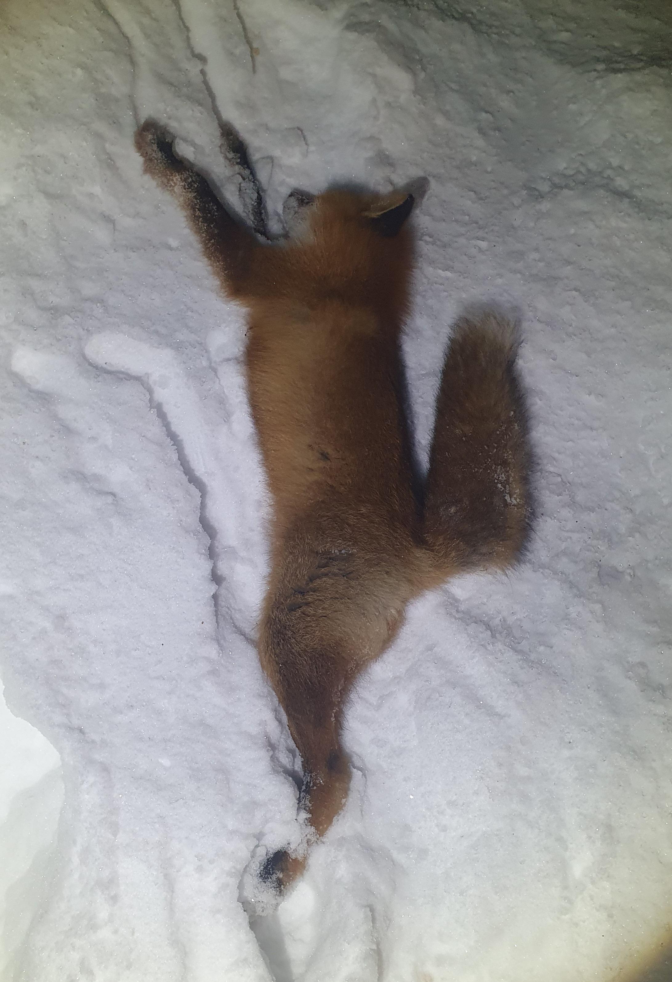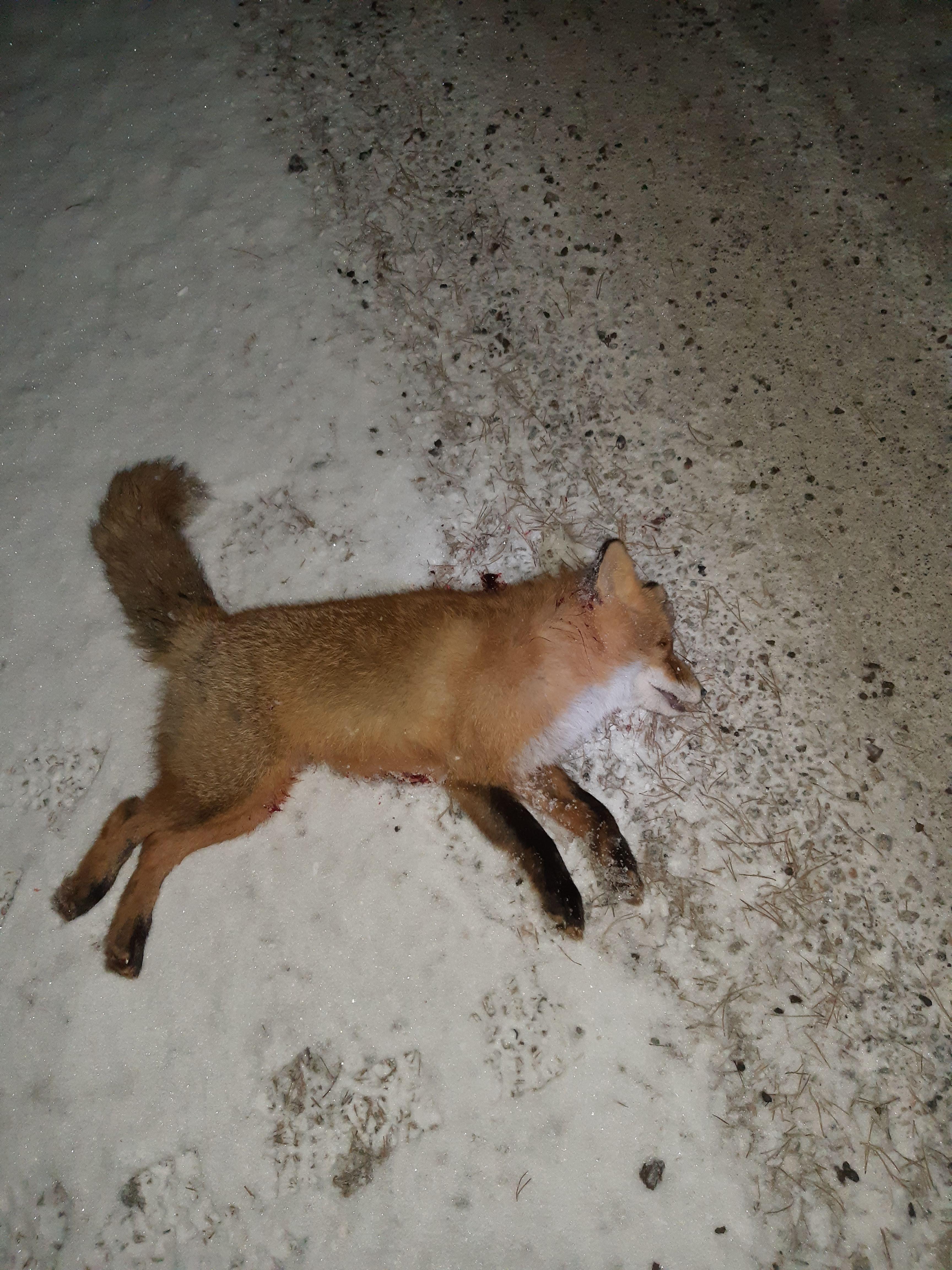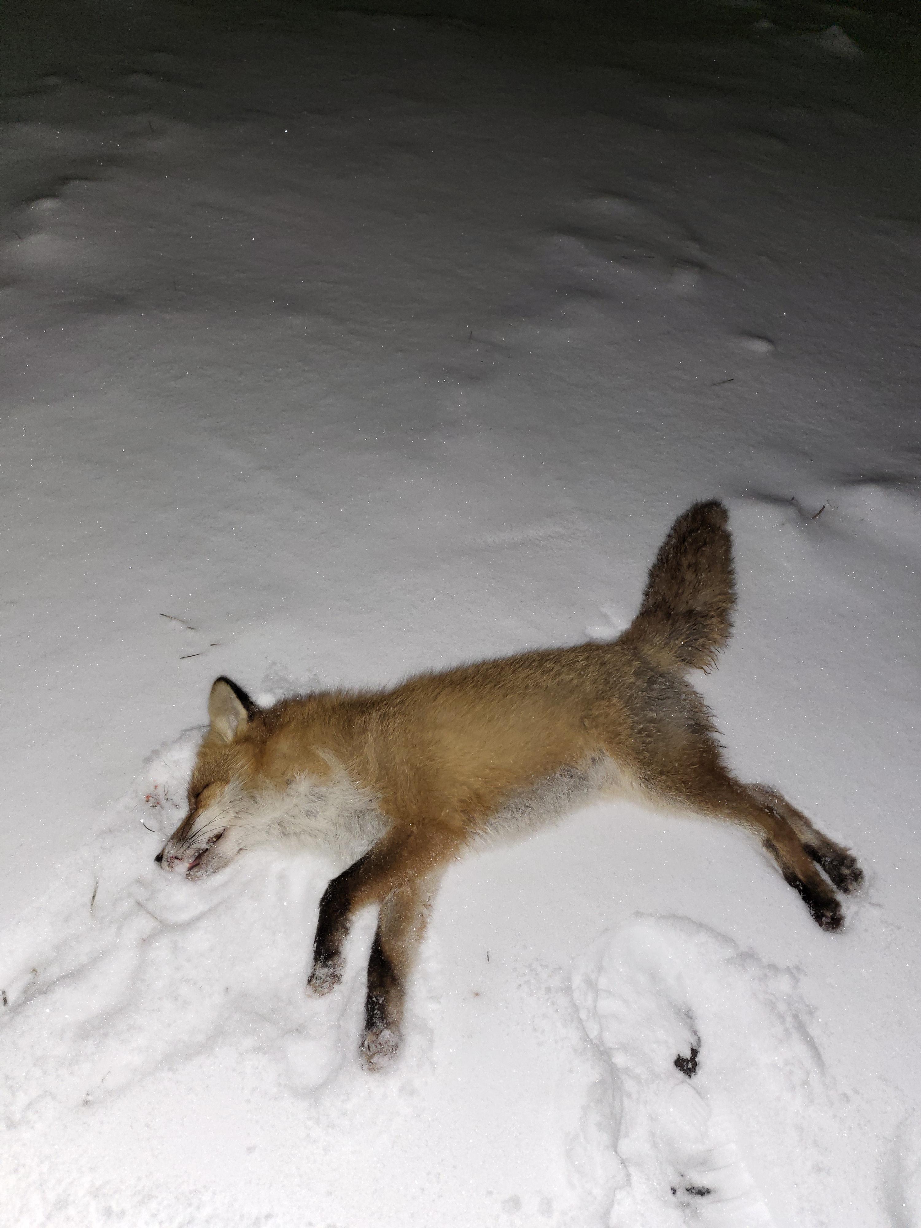 Publicerat Januari 17, 20224 yr Detta är en populär post. 4e räven för i vinter och alla 4a har vart hanar samtidigt har alla vart relativt stora. Vinterns värsta storm inatt, extremt blåsigt och lät lite överallt i huset så yngsta hunden har vart överallt och lyssnat sen upp i sängen om vart annat. Så när jag var upp titta 01,50 så skulle räven passera så blev att skjuta från fel fönster på kanske 40m istället för där åteln är på typ 100m. Stormen gjorde troligen att räven inte hörde fönstret. 308 med jaktmatch som jag gjort lite plattare framtill så gick den mellan 10-15m efter skottet. Pricken i pälsen lurar att skottet tagit långt bak men det sitter in och ut just bakom bogarna. Hunden fick iaf bråttom komma se vad som hände när det small.