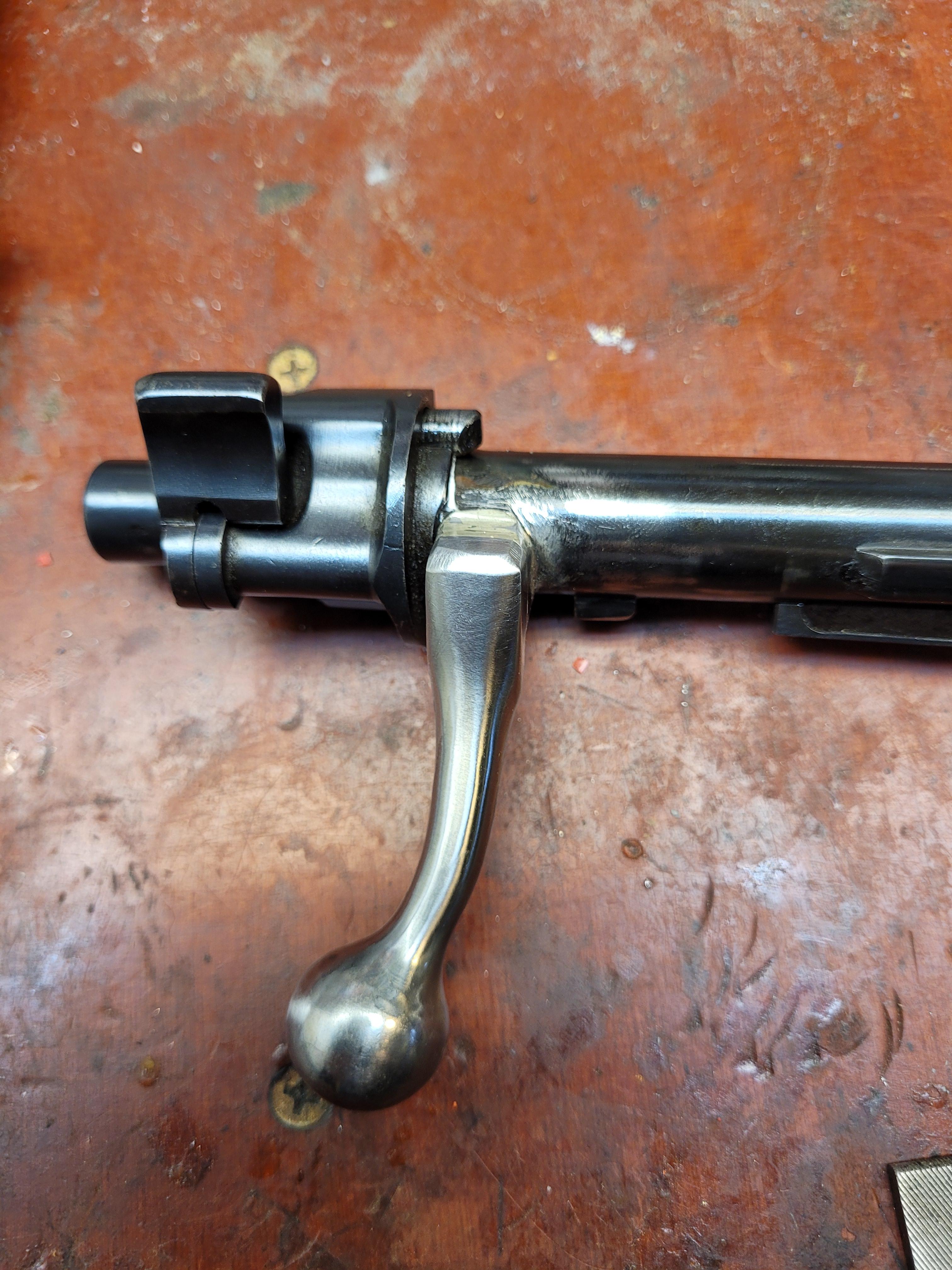 Publicerat Augusti 1, 20223 yr Detta är en populär post. Får man inte en 9,3X62 patron i ett 9,3X57 kammare... så är det bara... NÅGOT annat ger sig före- i detta fall slutstyckshandtaget 😆 handtaget var krökt och svetsat för länge sen för att gå fritt om siktet- och hårt slipat... men det gick att få "rent" metall så jag fräste av ett 1900 handtag och silverlödde dit det och då vart det så här när jag hade putsat till det hela lite: