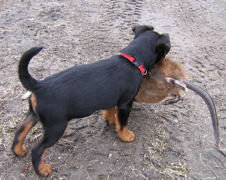 Publicerat April 17, 200718 yr Författare Alice växer så det knakar. Igår när vi var på väg ut i skogen så stötte vi iväg ett rådjur som Alice spårade ca 30 meter innan hon och husse tappade spåret. Idag skjöt jag en bisam som min äldre hund Jack (Amstaff) apporterade. Sedan tog Alice över och struttade omkring med råttan som nästan var lika stor som hon själv