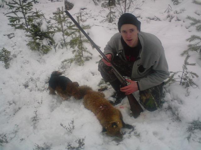 Publicerat Januari 7, 200818 yr Författare Sturjägarn JR ligger hemma och fäller tårar nu!! TB har åter igen lyckats ganska så bra. Kl 08:30 va vi 4 kompisar som var ut och skulle försöka oss på lite rävar. Till vår hjälp hade vi en rävdrivande Basset och en liten terrier. Hade inspår från räv i gryt tidigt på morgonen men hunden var inte intresserad av någon anledning. Struntade i det grytet och åkte ut på skogen. Släppte basseten på färska rävspår. Dröjde inte länge förrän hon började driva. Drevet pågick i ca 5 min när hon plötsligt började (som det lät) skälla ståndskall) en av polarna kom fram där hon stod utanför ett stengryt och ville in. Koppla basseten och dit med terriern. Släppte in hon i grytet och skallen dunkade under backen i ca 25 min. Kopplade terriern och stod alla 4 och väntade på räven som aldrig kom. Släppte terriern igen som mötte räven i grytingången. 2 av kompisarna gick ner och fick se räven när han flyttade på en sten. La en sten för en annan ingång och sedan skulle dom hem och hämta spett,spade och grytpistol. När dom har gått bort 10 m från grytet så började dom diskutera. Själv stod jag kvar och tittade på grytingången när jag plötsligt fick syn på ett par rävöron. Räven kom ut som skjuten ur en kanon. Hanarna på farfars gamla huskvarna spändes och en gyttorp 3a ekade. Räven blev på platsen men fick lov att ha en till smäll. Kompisarna stod som frågetecken och trodde jag hade skjutit vådaskott men sen så bröt lyckan ut. Kompisens terriers andra räv var ett faktum och NR 9 hänger på väggen //"TB"