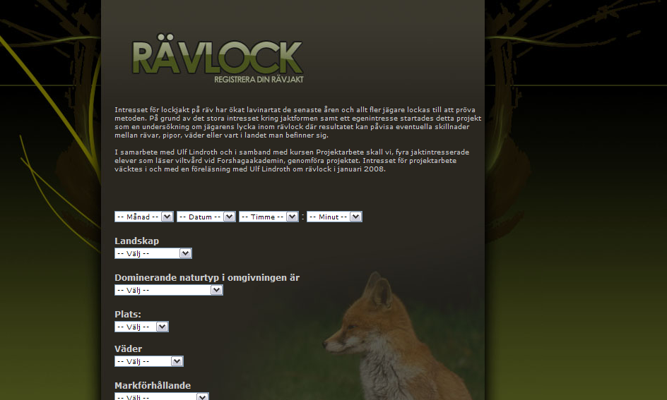 Publicerat Oktober 20, 200916 yr Hoppas att ingen missat att det finns en forumlär om lockjakt på räv Intresset för lockjakt på räv har ökat lavinartat de senaste åren och allt fler jägare lockas till att pröva metoden. På grund av det stora intresset kring jaktformen samt ett egenintresse startades detta projekt som en undersökning om jägarens lycka inom rävlock där resultatet kan påvisa eventuella skillnader mellan rävar, pipor, väder eller vart i landet man befinner sig. I samarbete med Ulf Lindroth och i samband med kursen Projektarbete skall vi, fyra jaktintresserade elever som läser viltvård vid Forshagaakademin, genomföra projektet. Intresset för projektarbete väcktes i och med en föreläsning med Ulf Lindroth om rävlock i januari 2008. http://www.viltvardsgymnasiet.se/ravlock/ R_vlock_hemsida.bmp