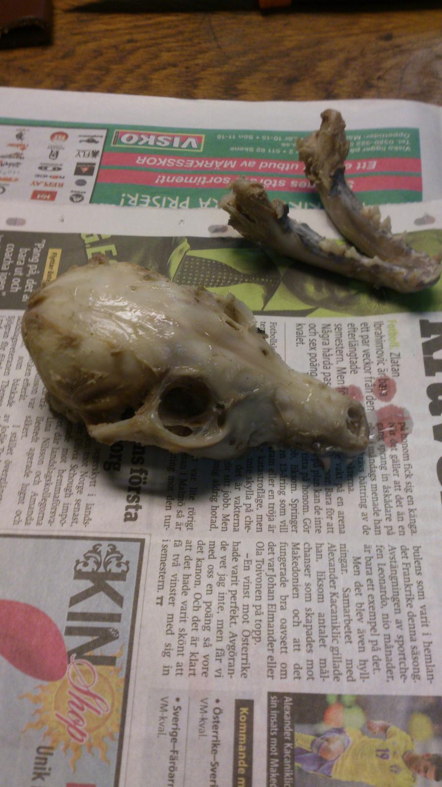 Publicerat Juni 13, 201312 yr Sköt mitt första pälsvilt, en räv, i tisdags morse(och min andra samma kväll) och tänkte ta till vara på skallen. Har kokat och skrapat rävskalle nu i eftermiddag, blev helt okej, eftersom det är en valp så var den lite mjuk i benet så några framtänder trillade ur men det är väl bara att limma, delade på underkäken också, men samma sak där, limma. Något speciellt lim man ska använda sig av? Då jag inte orkar köpa en massa grejer så gick jag igenom vad som fans i kem-hyllan hemma. Hittade "Vanish" fläckborttagning för kläder. "Innehåller 5-15% Syrebaserat blekmedel" En snabb googling och jag hittade det vanligaste syrebaserade blekmedlet, Väteperoxid. Så jag har provat att blöta en papperstuss på en gammal hitte-skalle av älgko, med ovan nämnda "Vanish", så får man se vad som händer